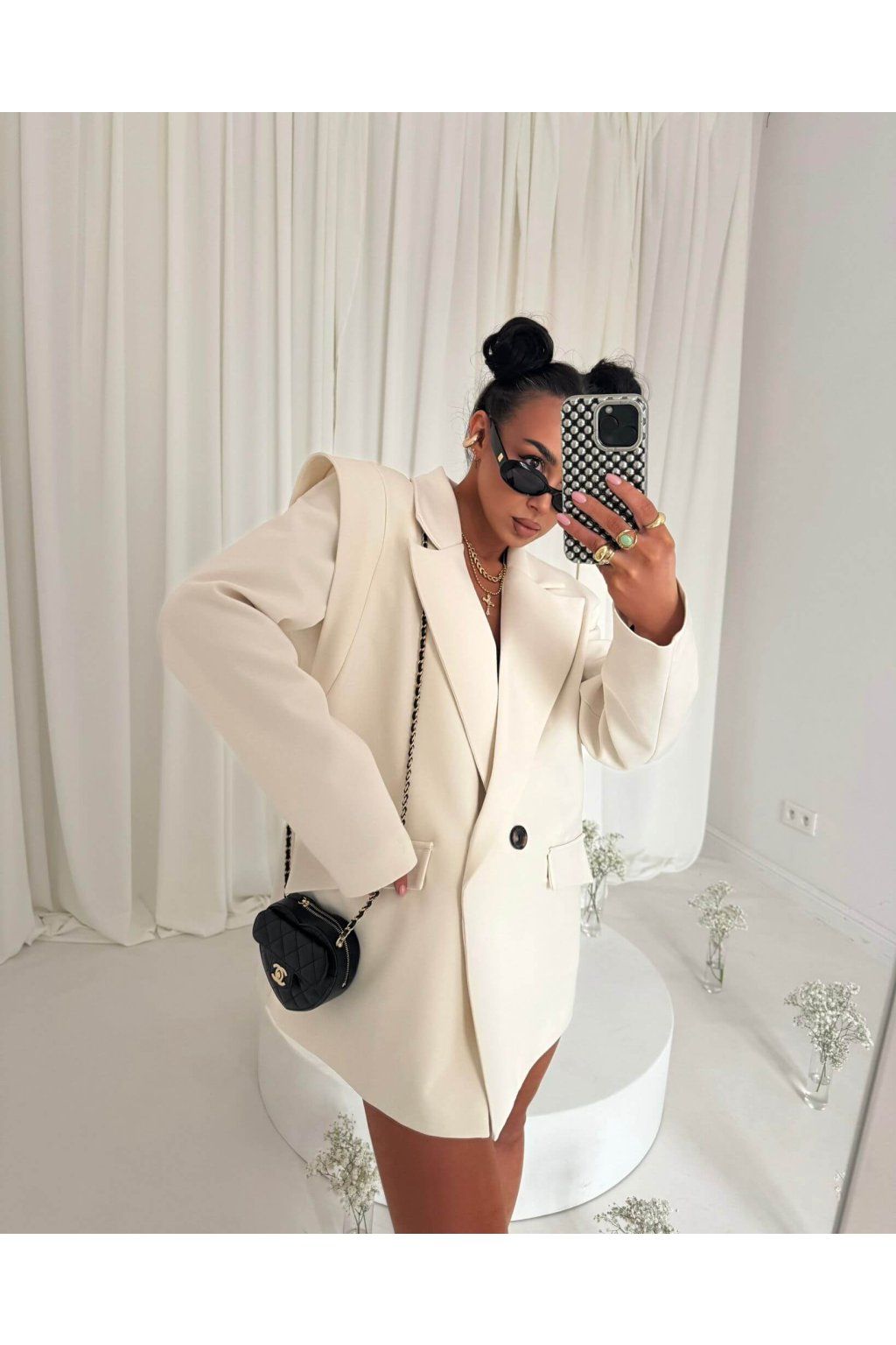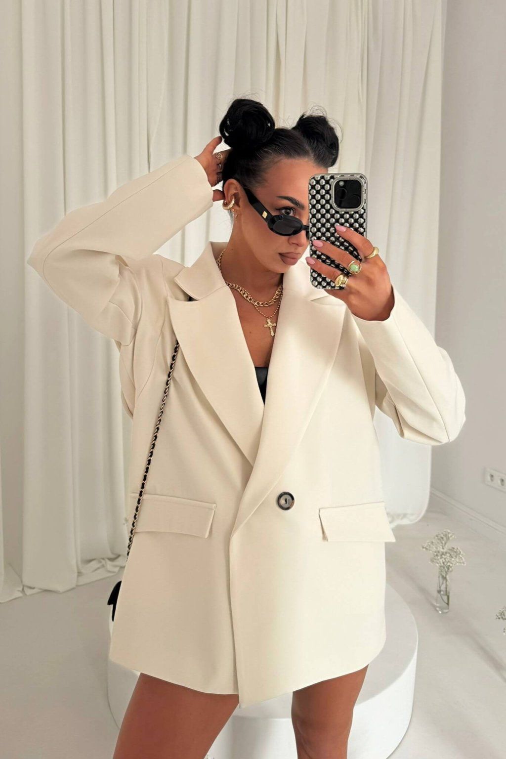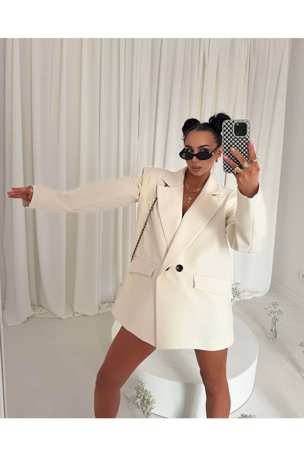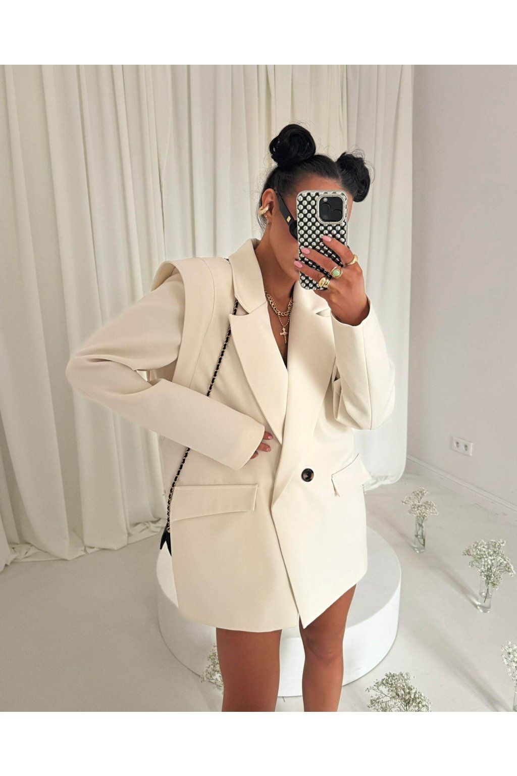 Viskózové dlhé béžové sako s dekoratívnym prvkom na ramenách. Model má ramenné vypchávky, vrecká a zapína sa na gombíky a opasok.