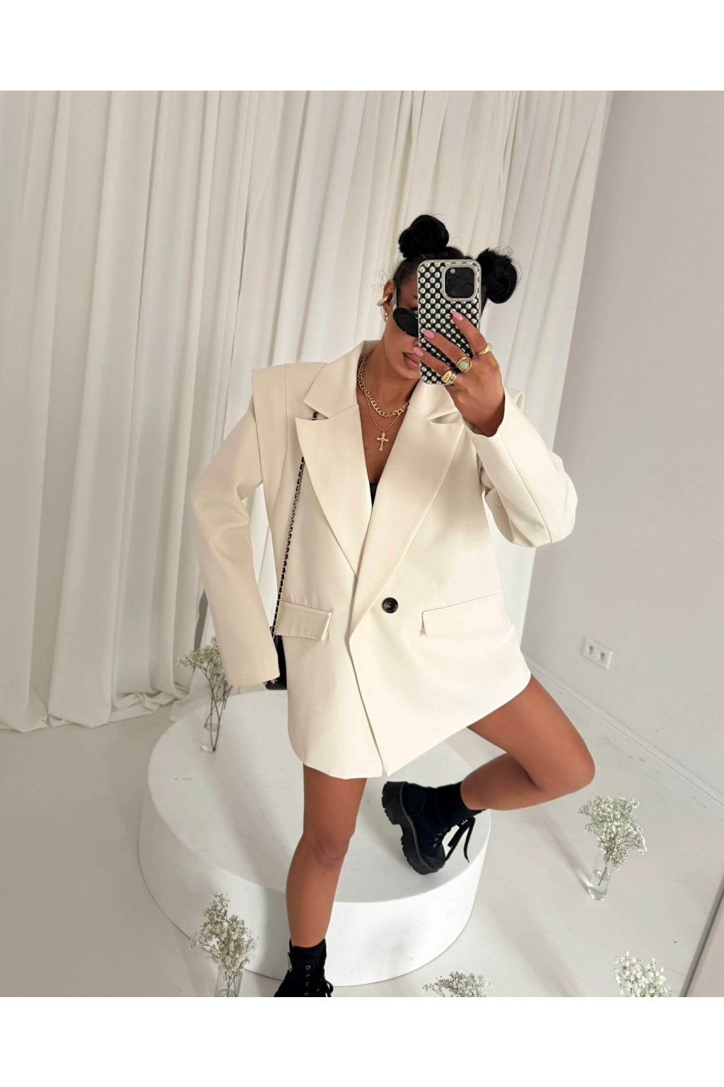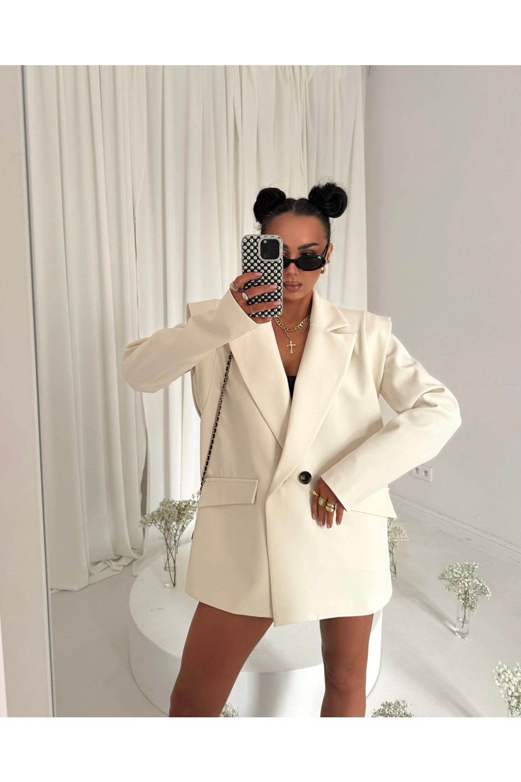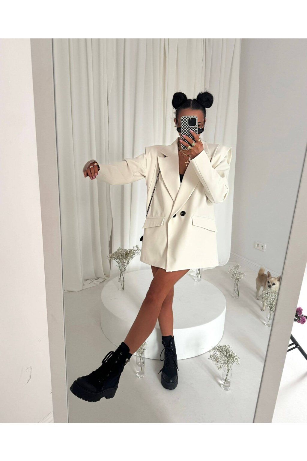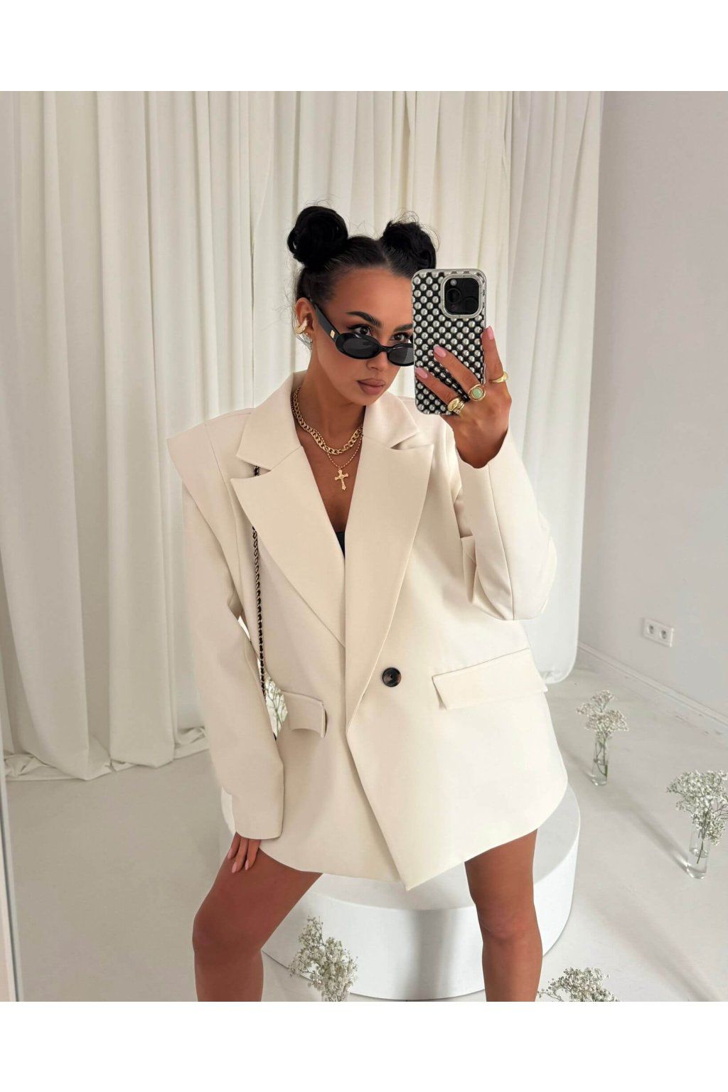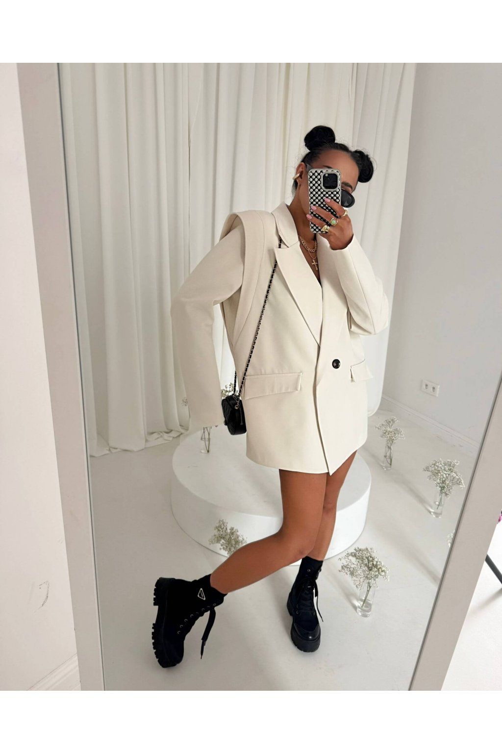 Viskózové dlhé béžové sako s dekoratívnym prvkom na ramenách. Model má ramenné vypchávky, vrecká a zapína sa na gombíky a opasok.