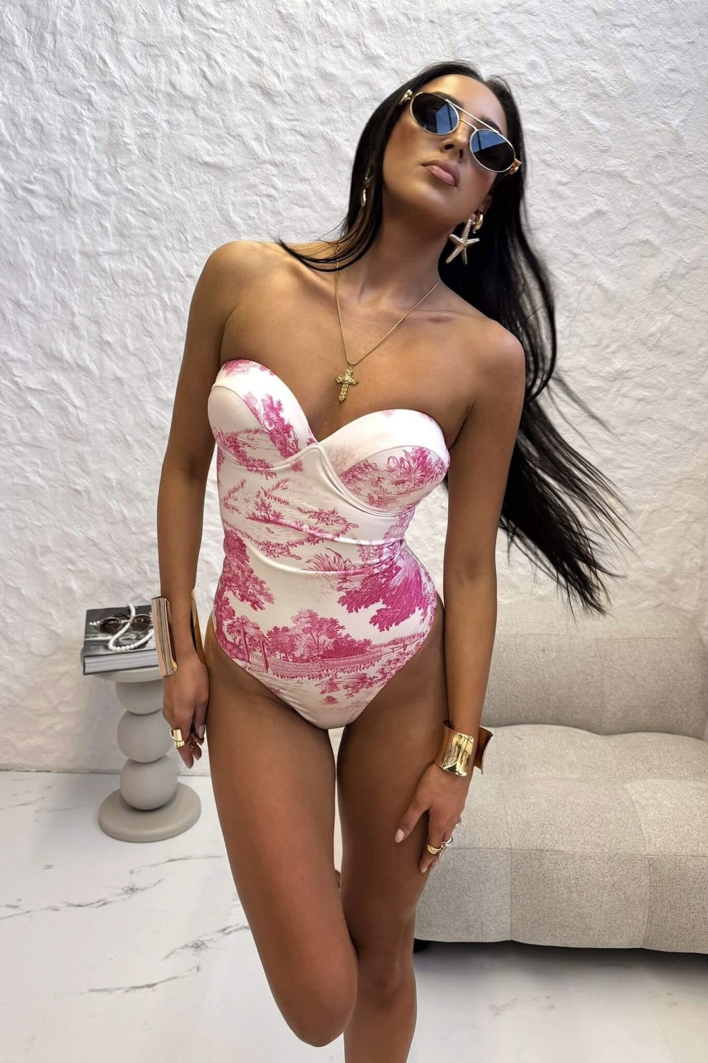 V jednom kúsku body aj plavky! Práve tým sú tieto body/plavky výnimočné. Vzor inšpirovaný ikonickou značkou Dior. Model má vystužené košíky a zapína sa na cvoky.