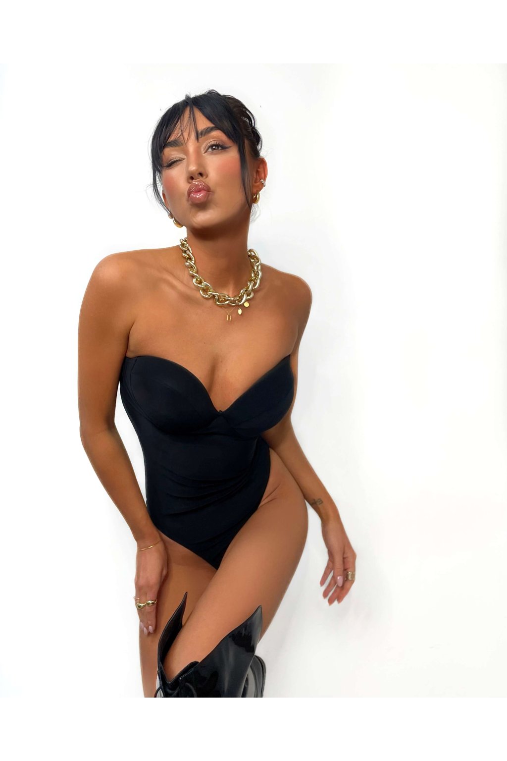 Čierne body s vystuženými košíkmi v tvare srdiečka. Model je zhotovený z dvoch vrstiev mäkkej, pružnej látky z oboch strán. Zapína sa dvomi cvokmi v jednom rade.