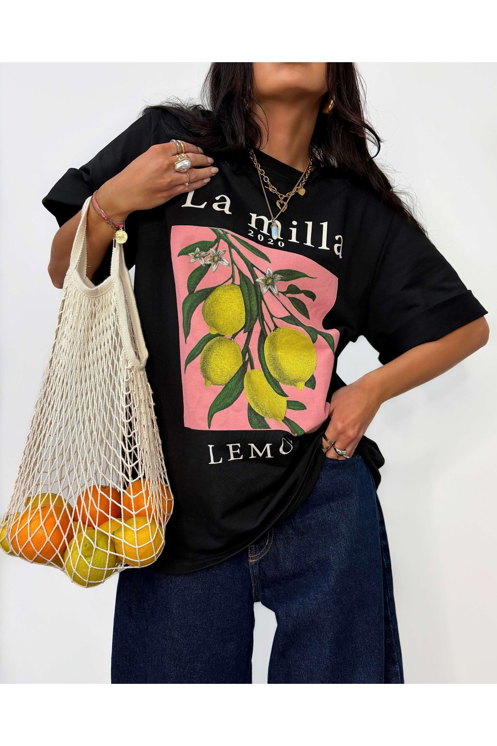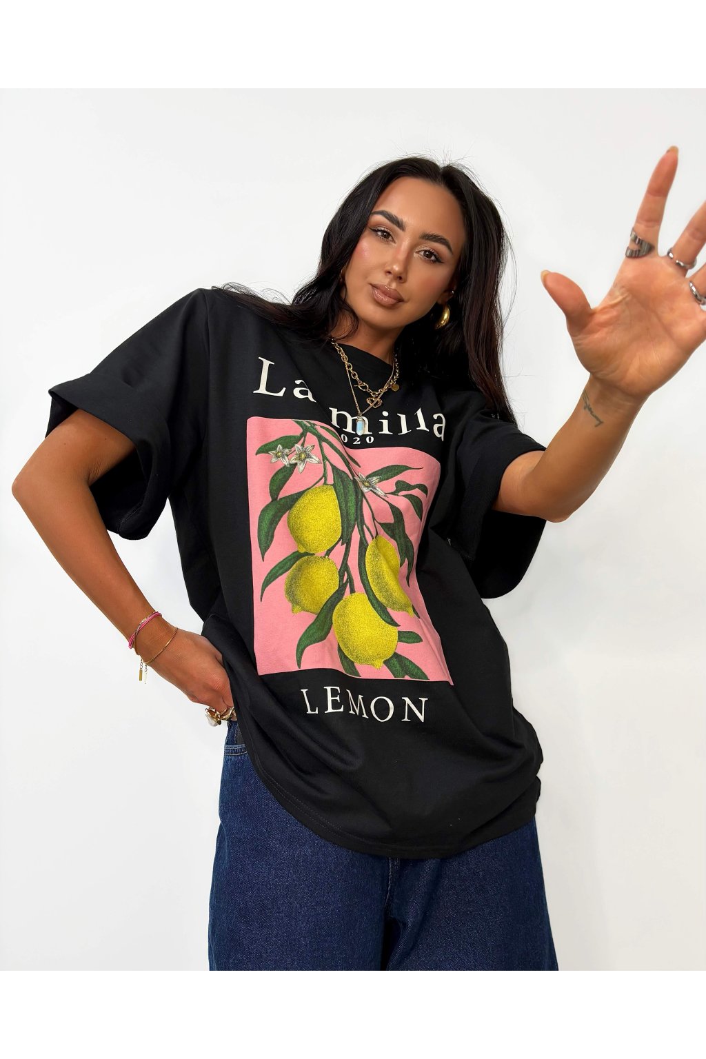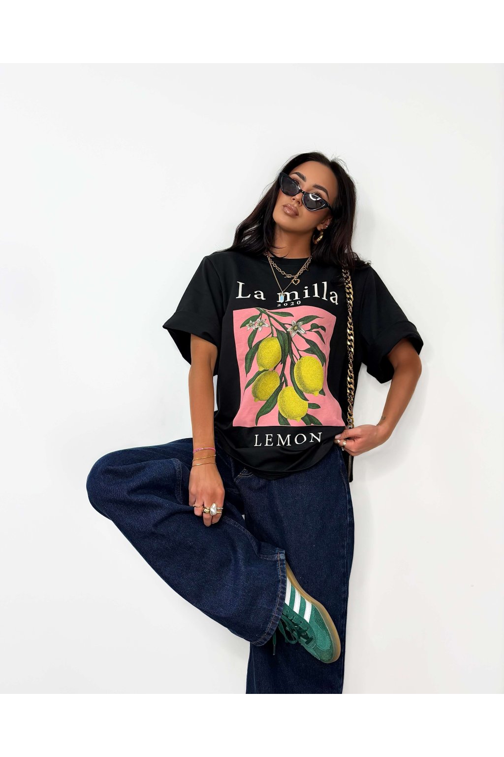 Tričko LEMON je vyrobené z 95% z bavlny. Materiál je mäkký, hrubší a pružný. Model je v čiernej farbe.