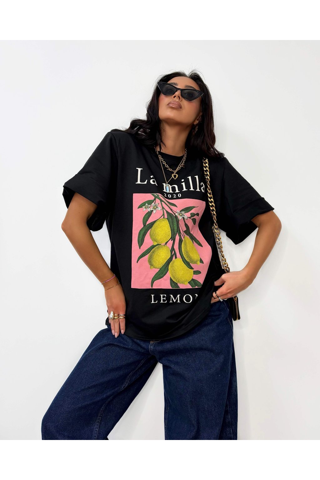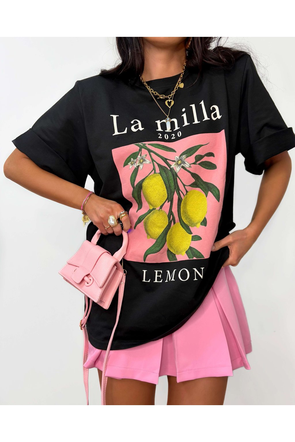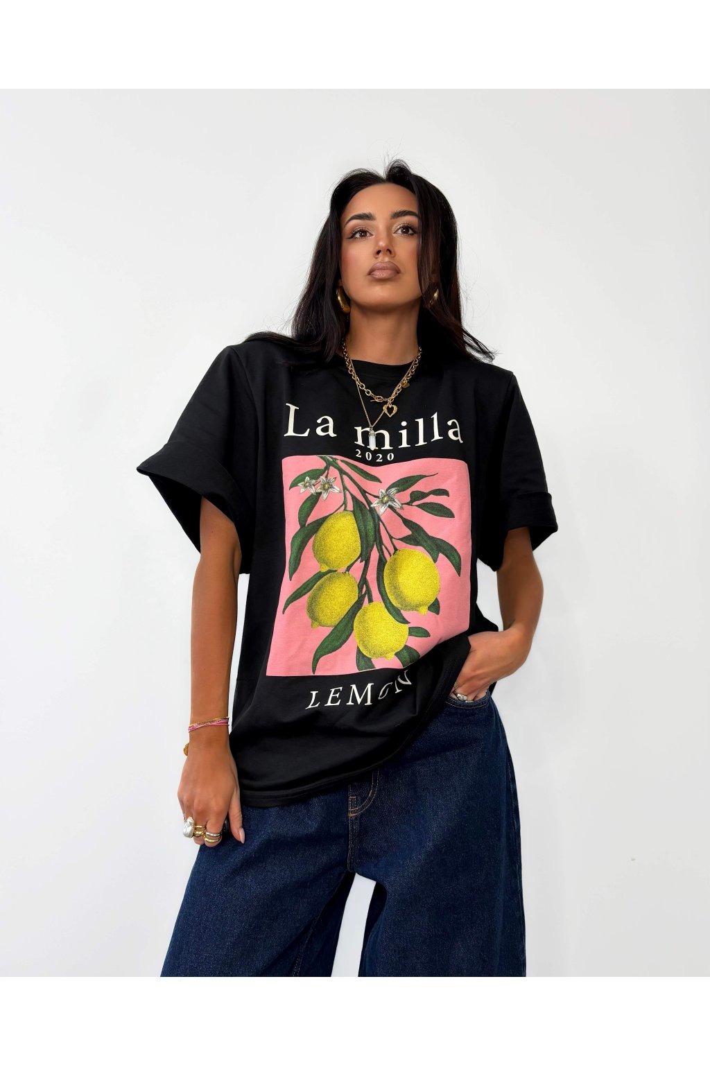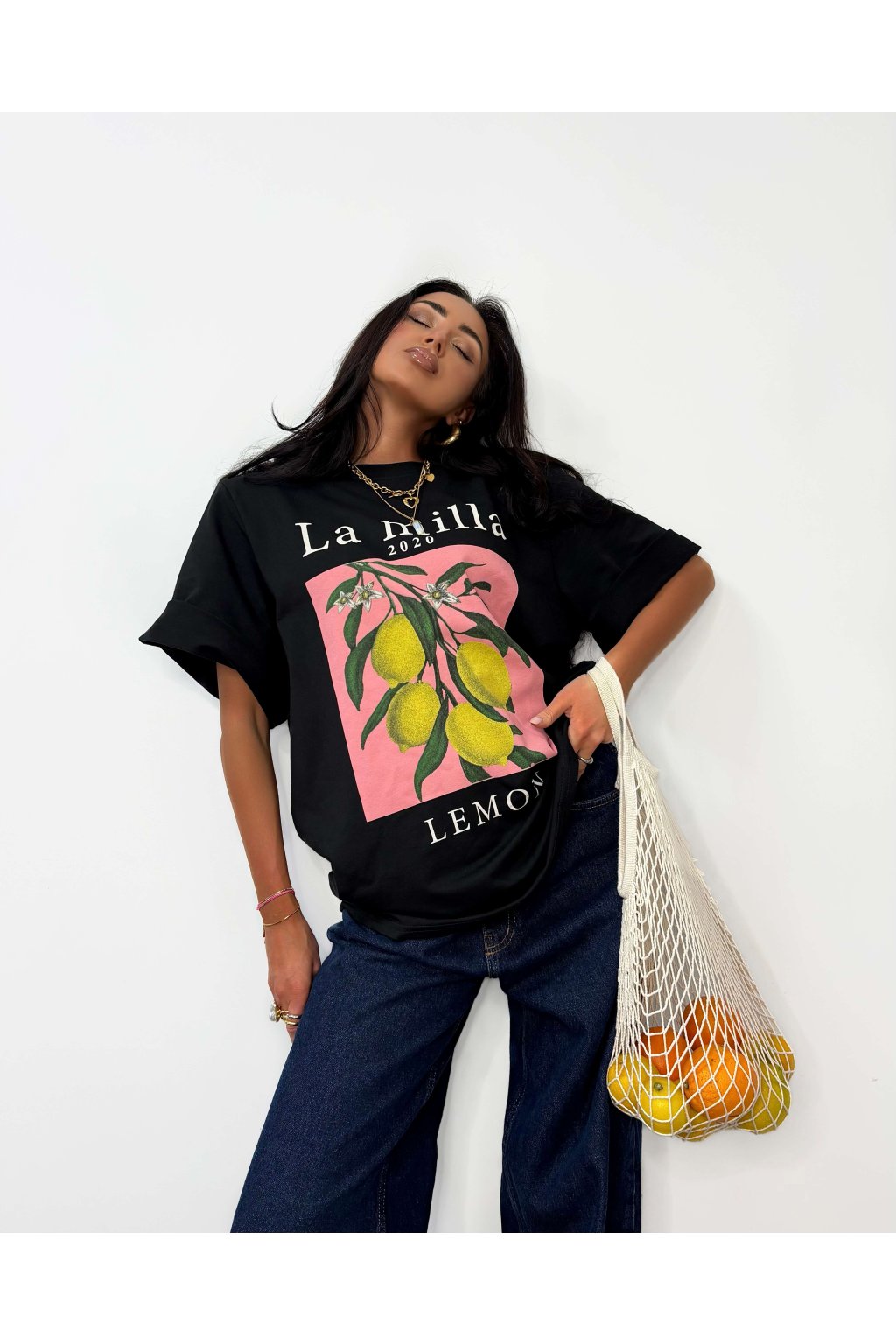 Tričko LEMON je vyrobené z 95% z bavlny. Materiál je mäkký, hrubší a pružný. Model je v čiernej farbe.