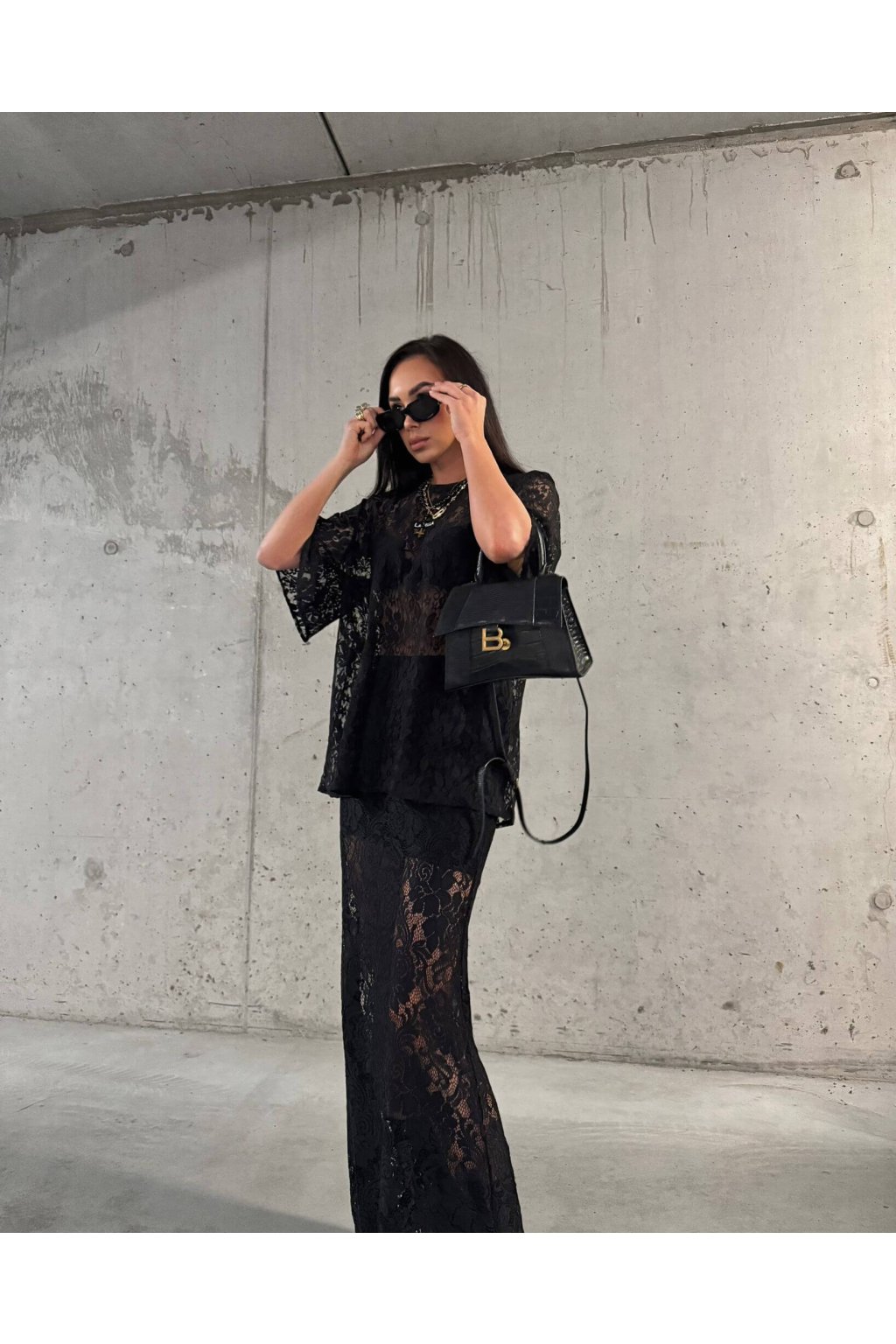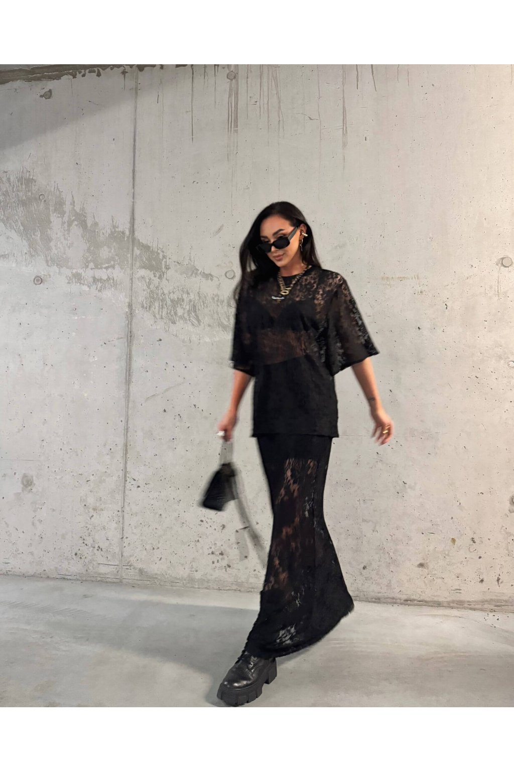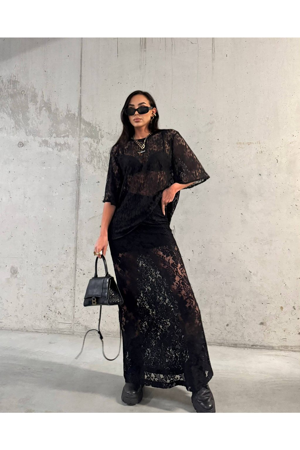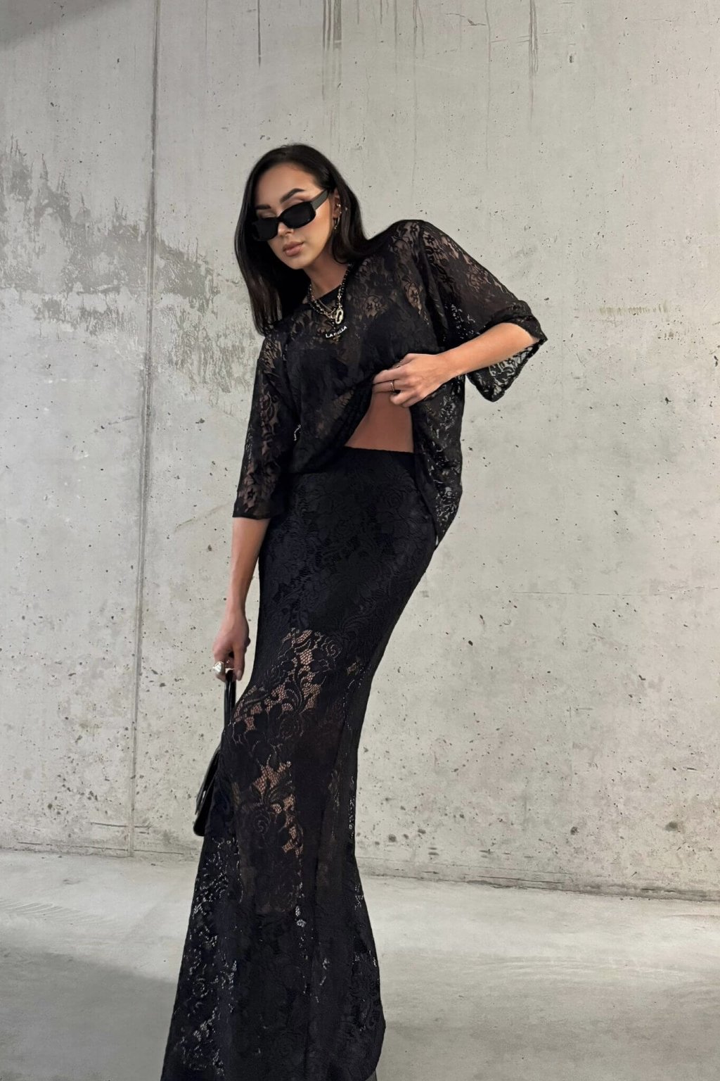 Čipkovaná sukňa v sofistikovanej čiernej farbe s očarujúcou maxi dĺžkou. Model má vysoký pás so širokou gumkou a krátku spodničku.