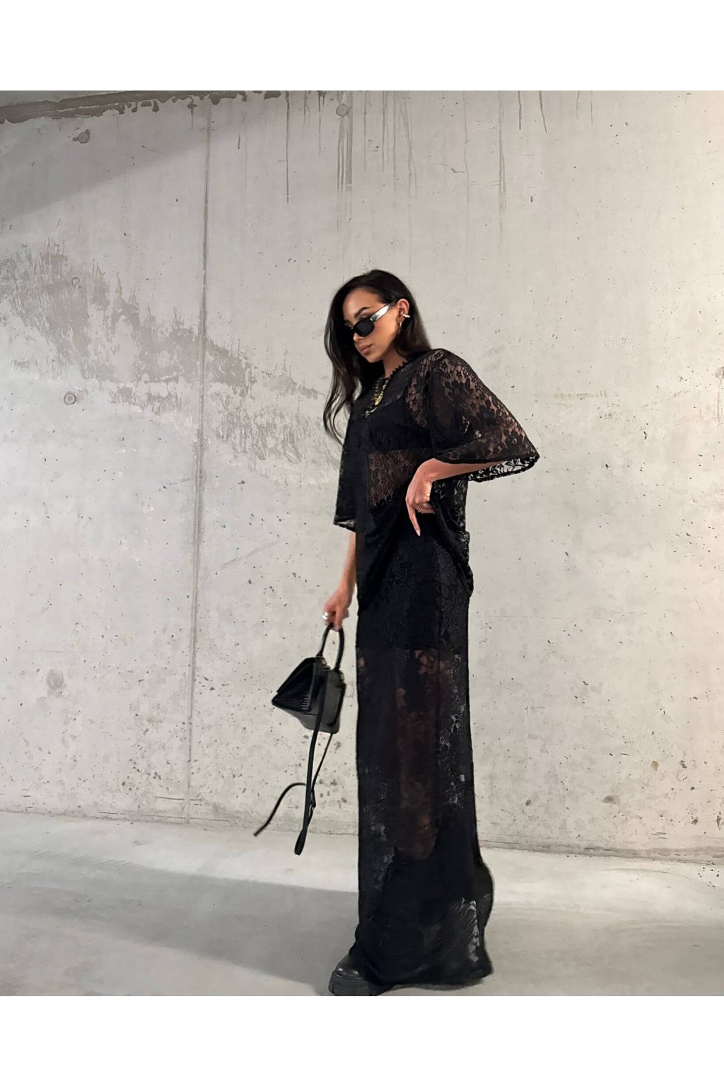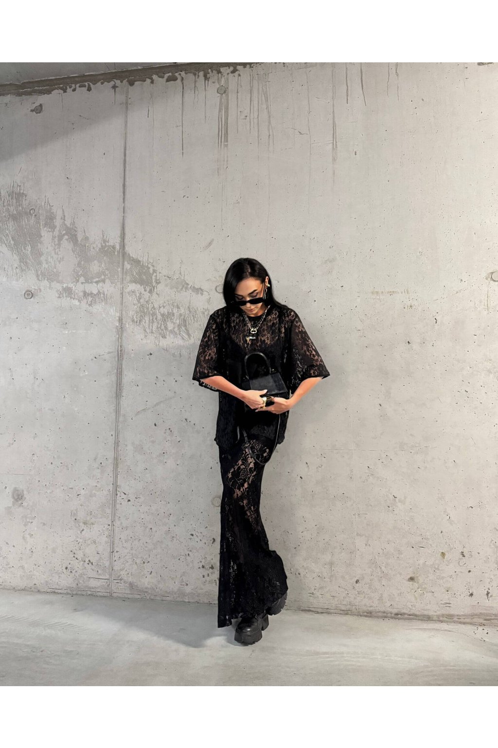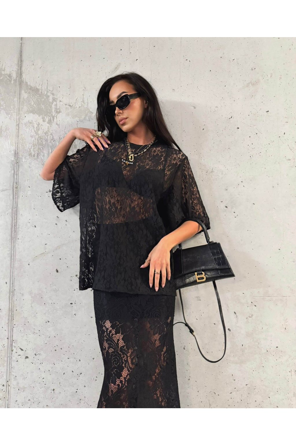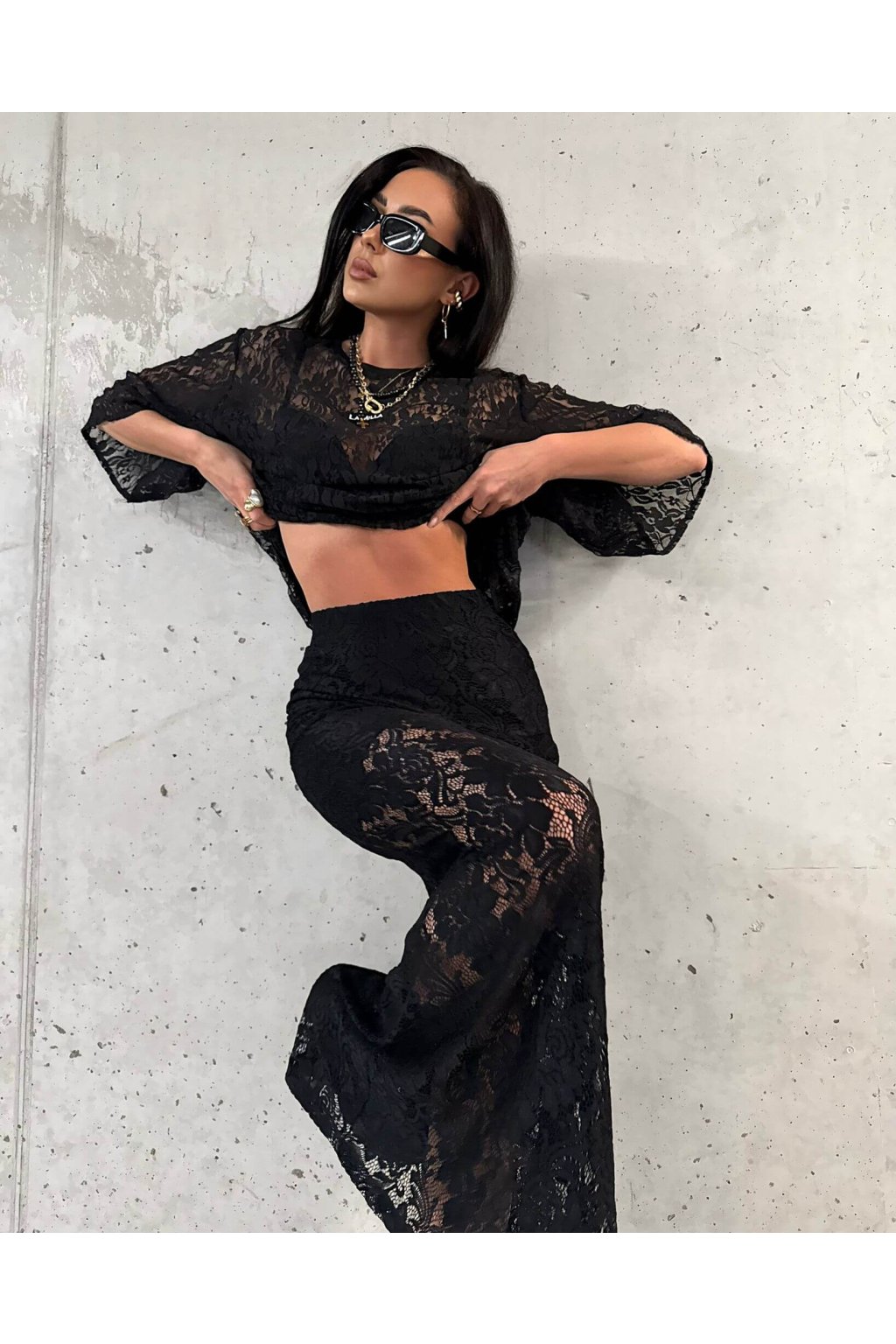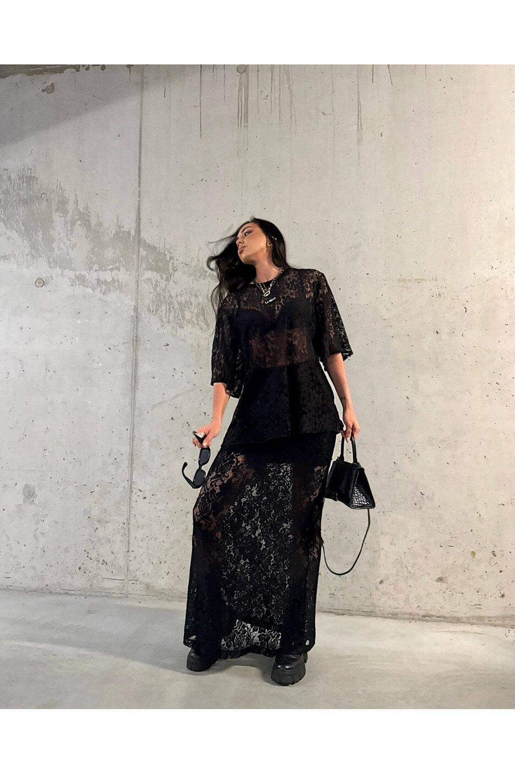 Čipkovaná sukňa v sofistikovanej čiernej farbe s očarujúcou maxi dĺžkou. Model má vysoký pás so širokou gumkou a krátku spodničku.