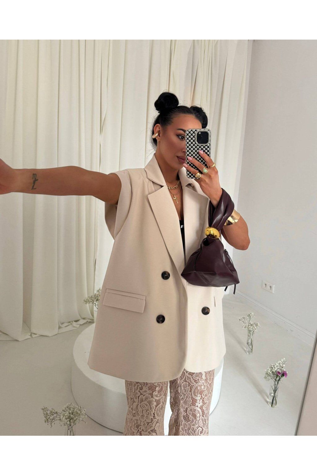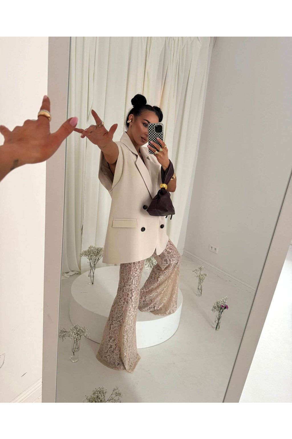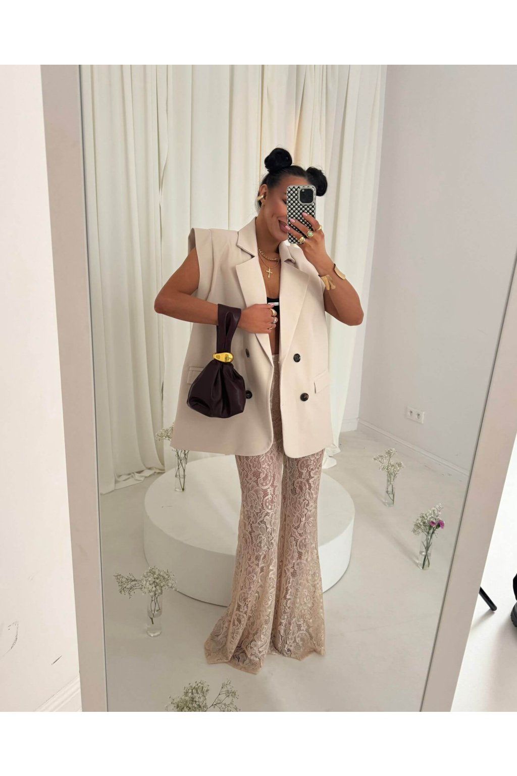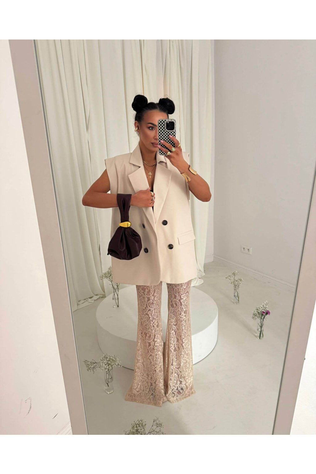 Nohavice AMIGOS sú vyrobené z transparentnej čipkovanej látky. Materiál je ľahký a vzdušný. Model je vo vzore kvetov, listov a jemných detailov. Kvetinové nohavice dodávajú outfitu ženský a romantický vzhľad. V béžovej farbe.