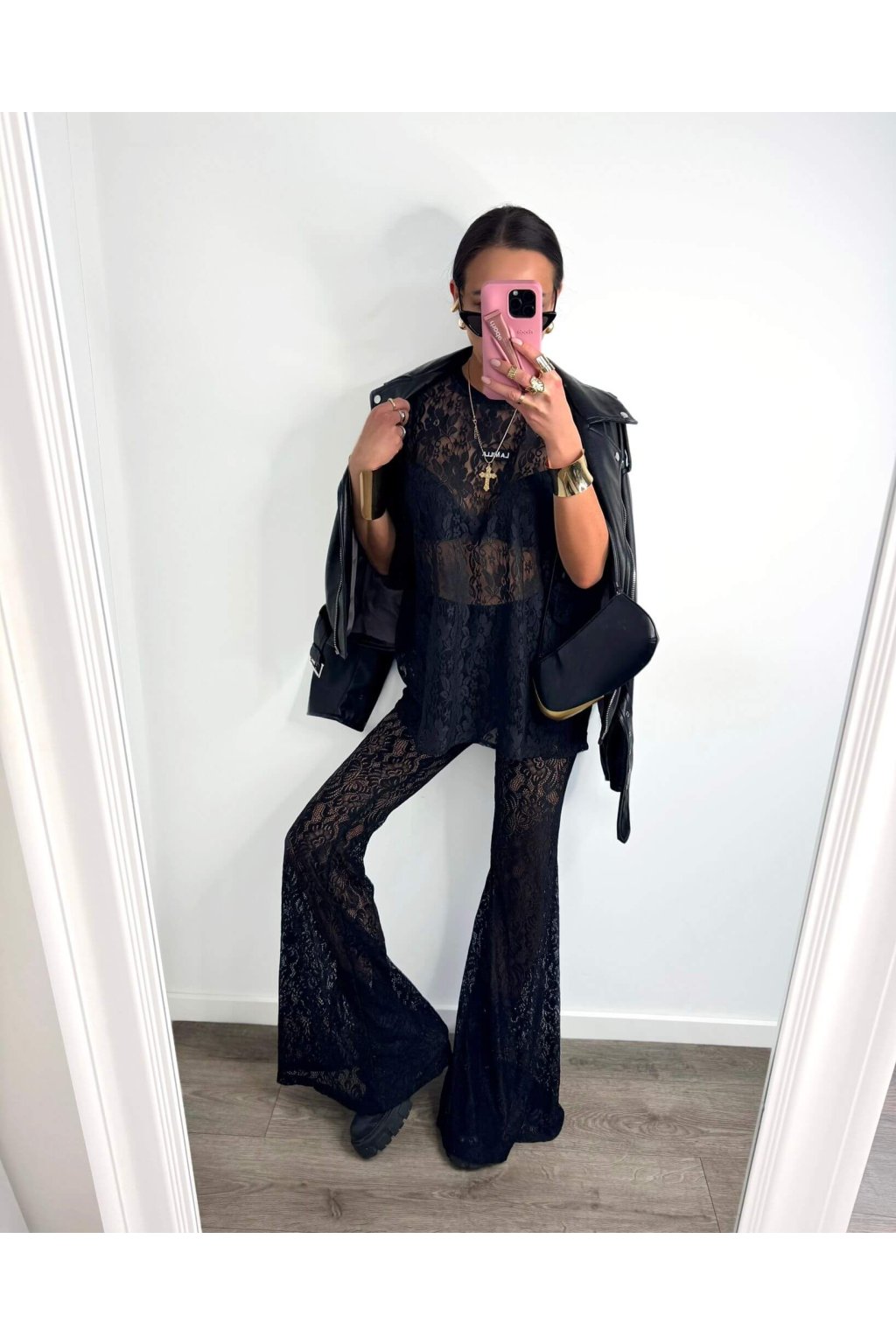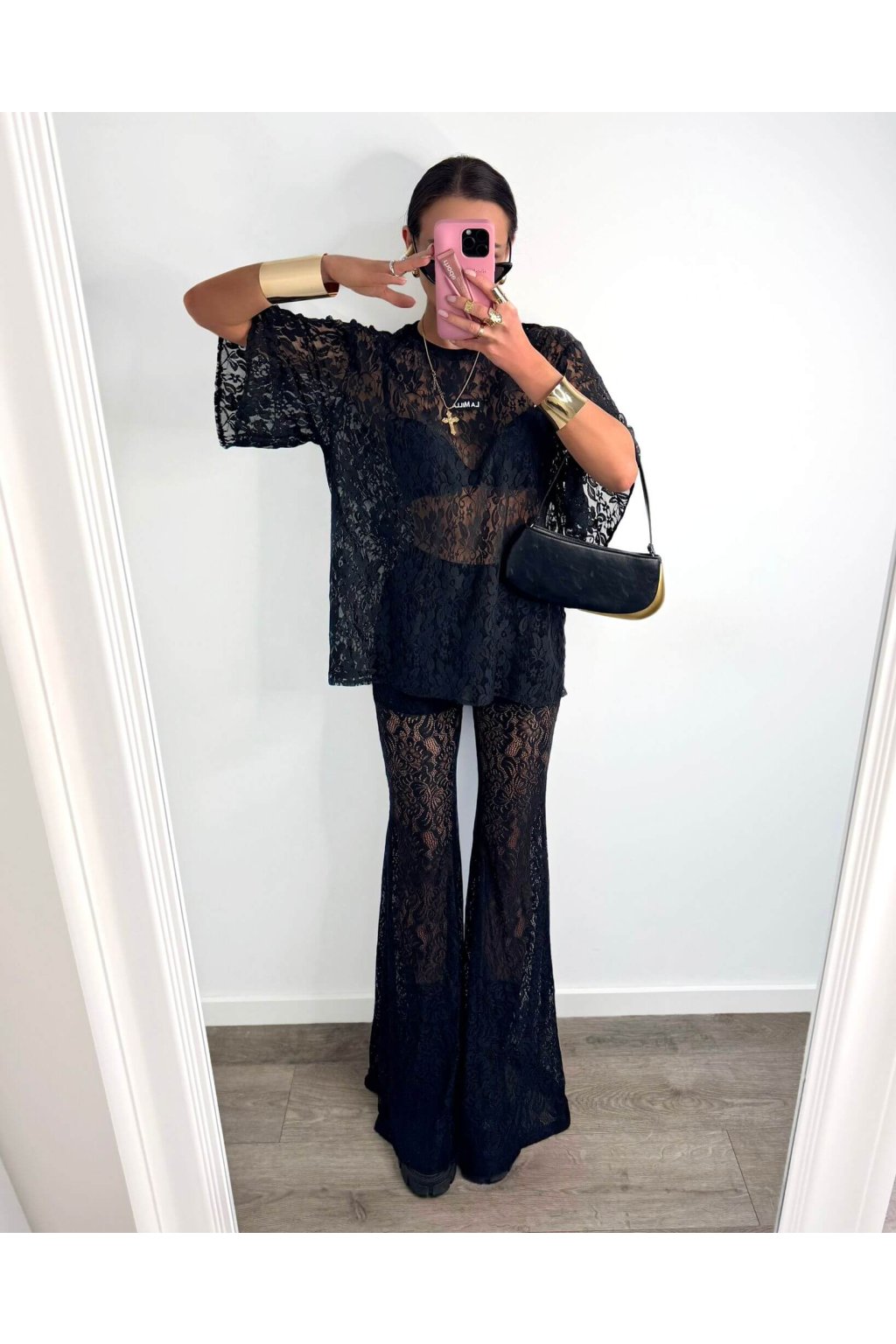 Tričko AMIGOS je vyrobené z krajkovej látky so vzorom kvetov. Model je v elegantnej čiernej farbe.