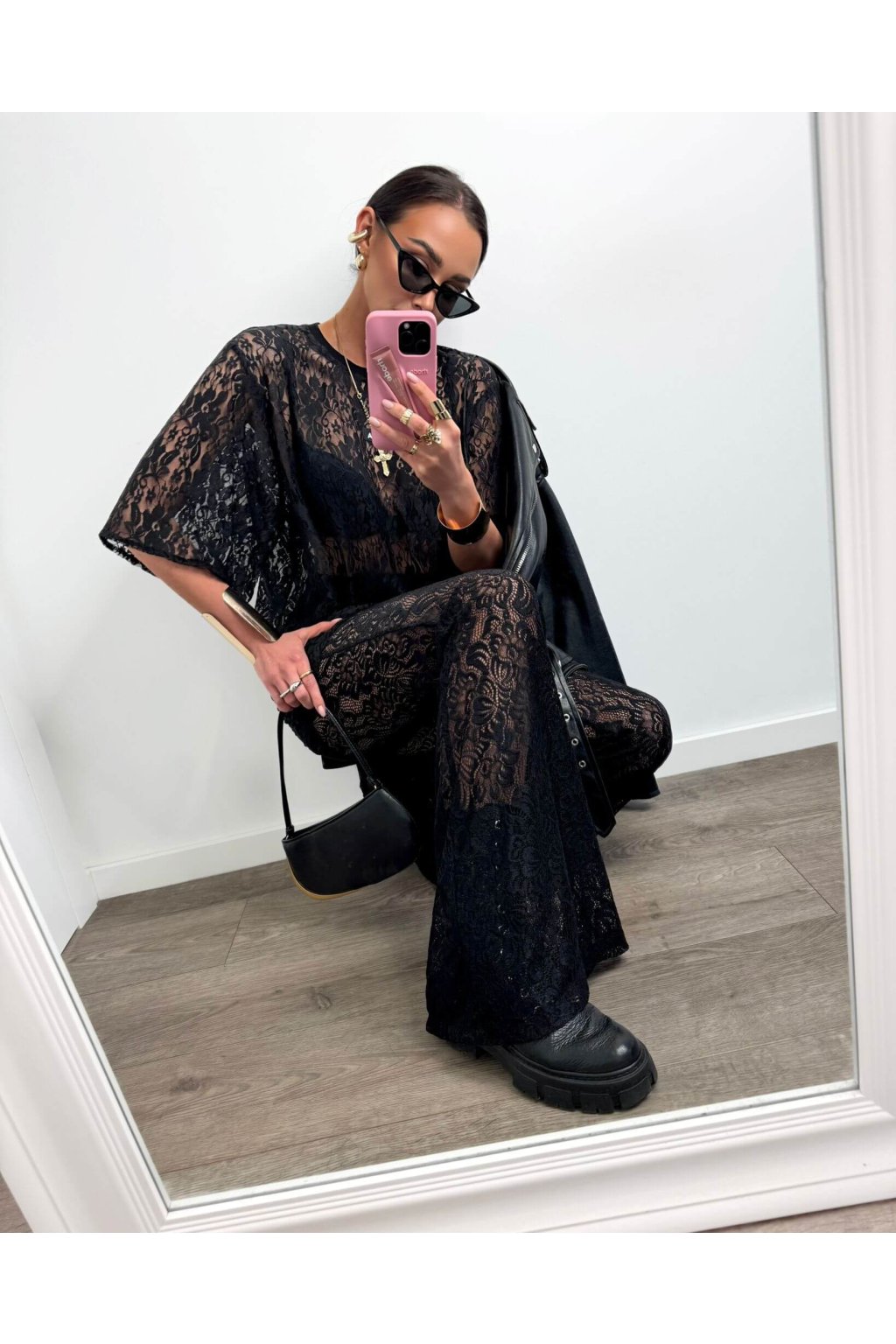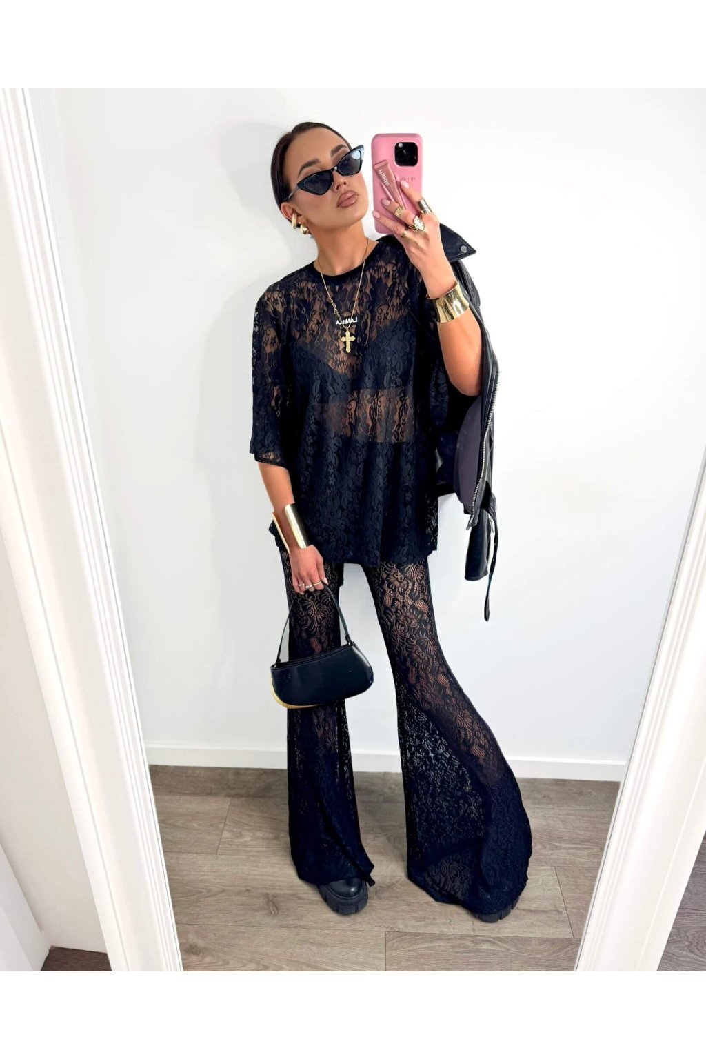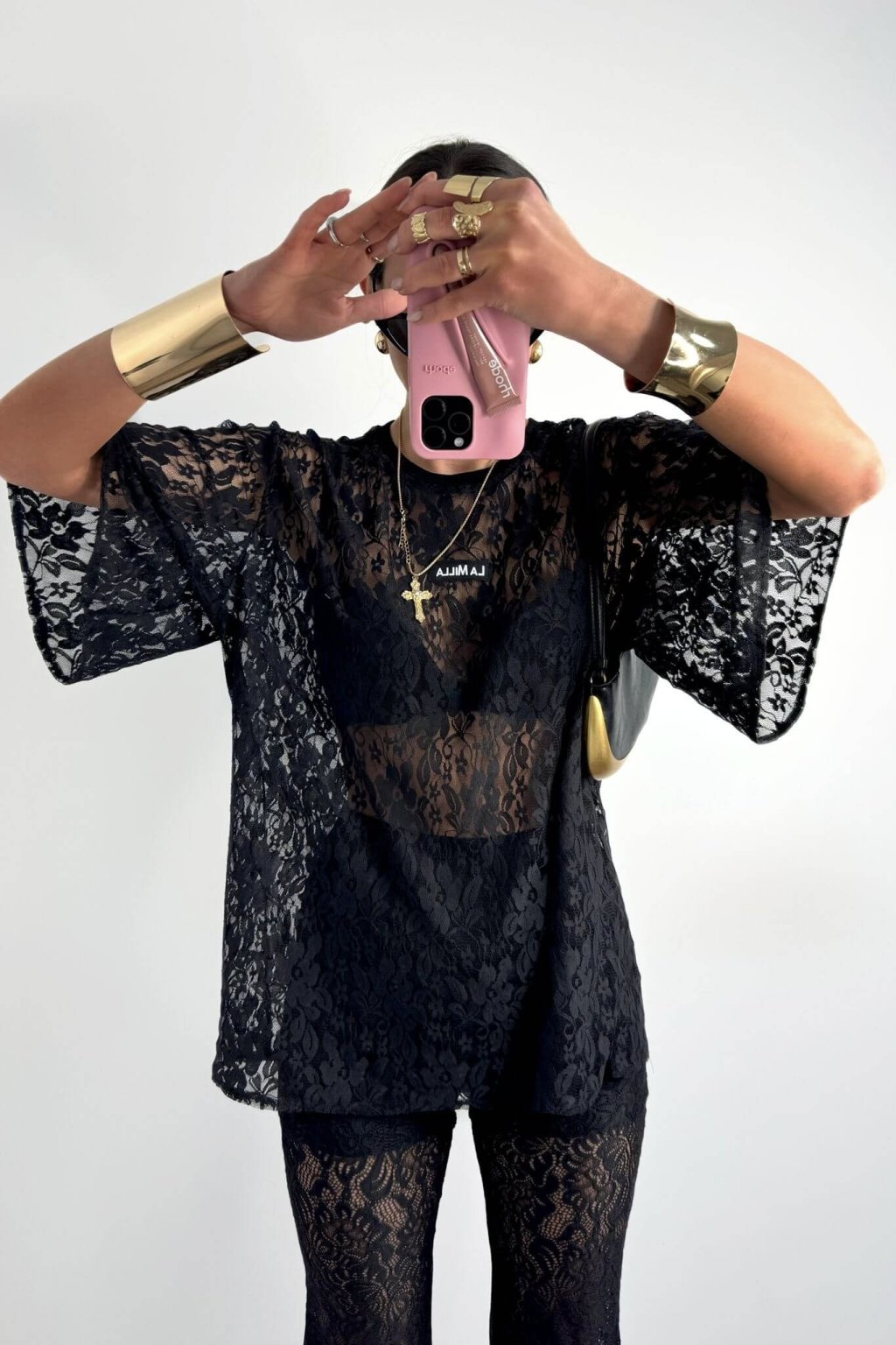 Bestsellerové čierne oversize tričko z priehľadnej krajkovej látky vo vzore kvetov. Model má lodičkový výstrih, krátke rukávy a zdobí ho logo značky.
