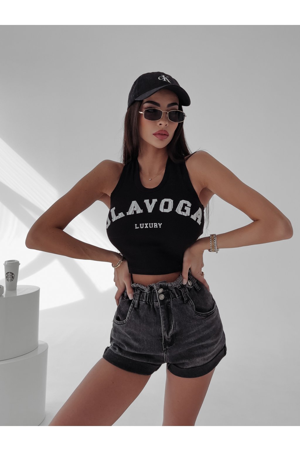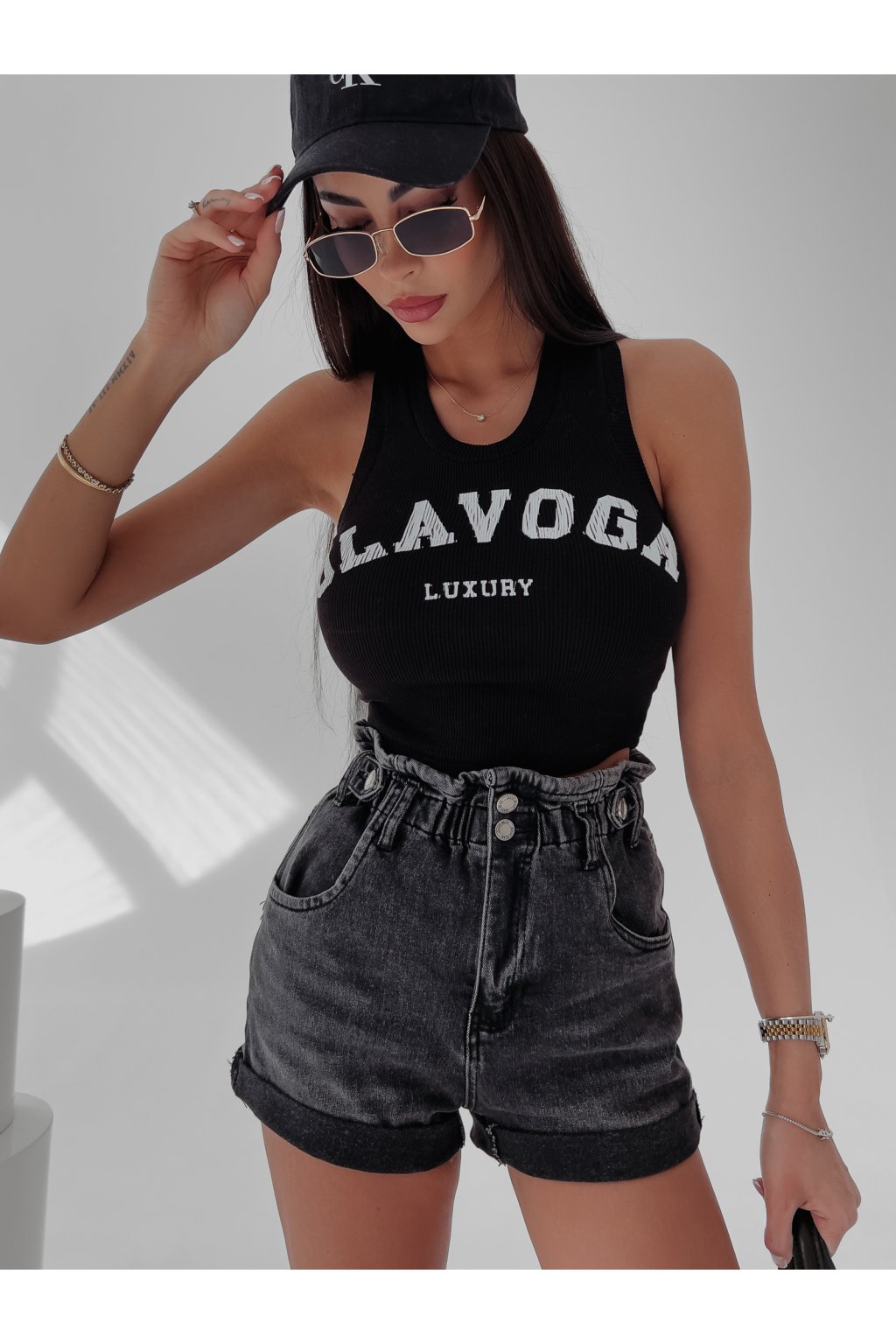 Top má široké ramienka, okrúhly výstrih a bielu potlač OLAVOGA LUXURY.