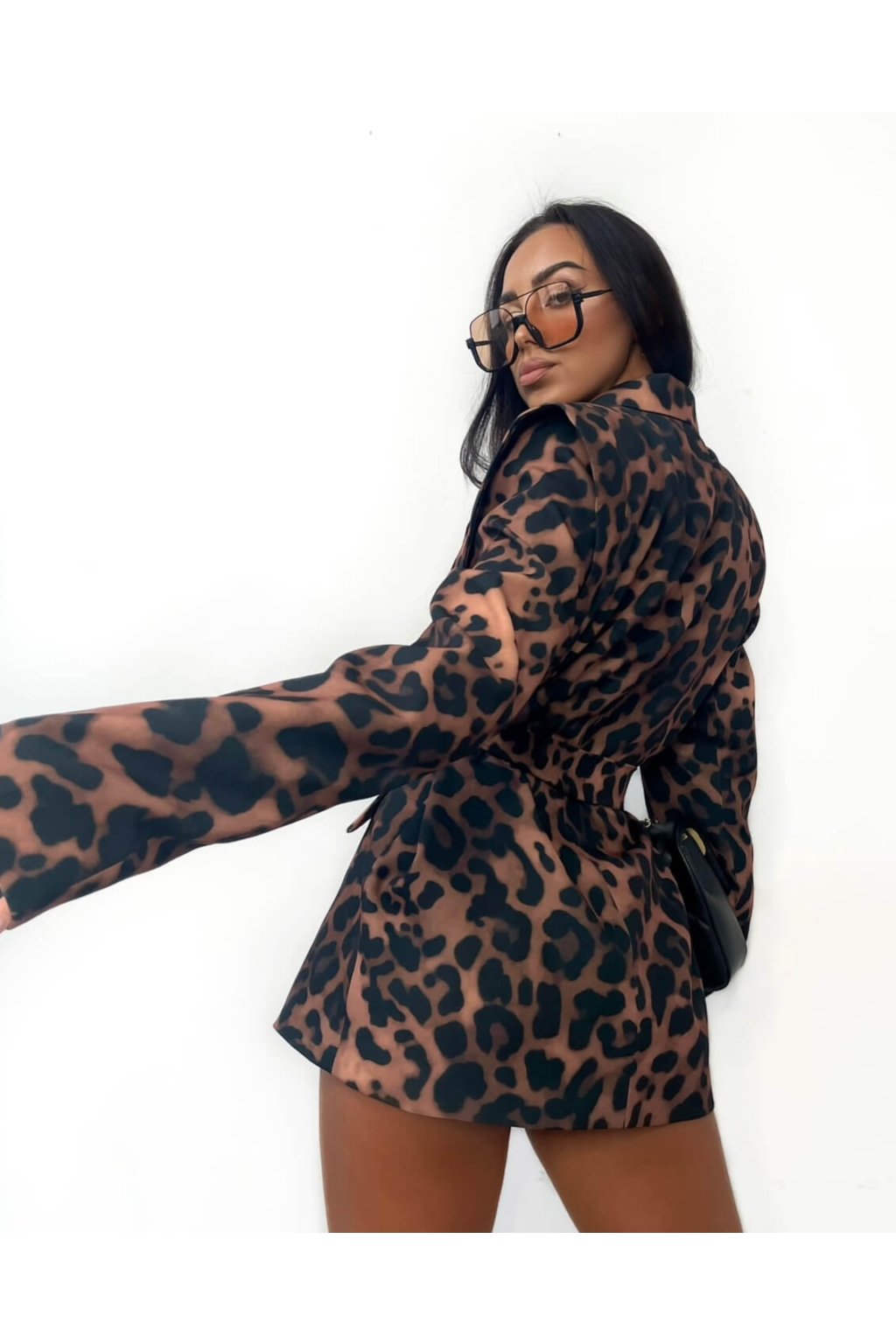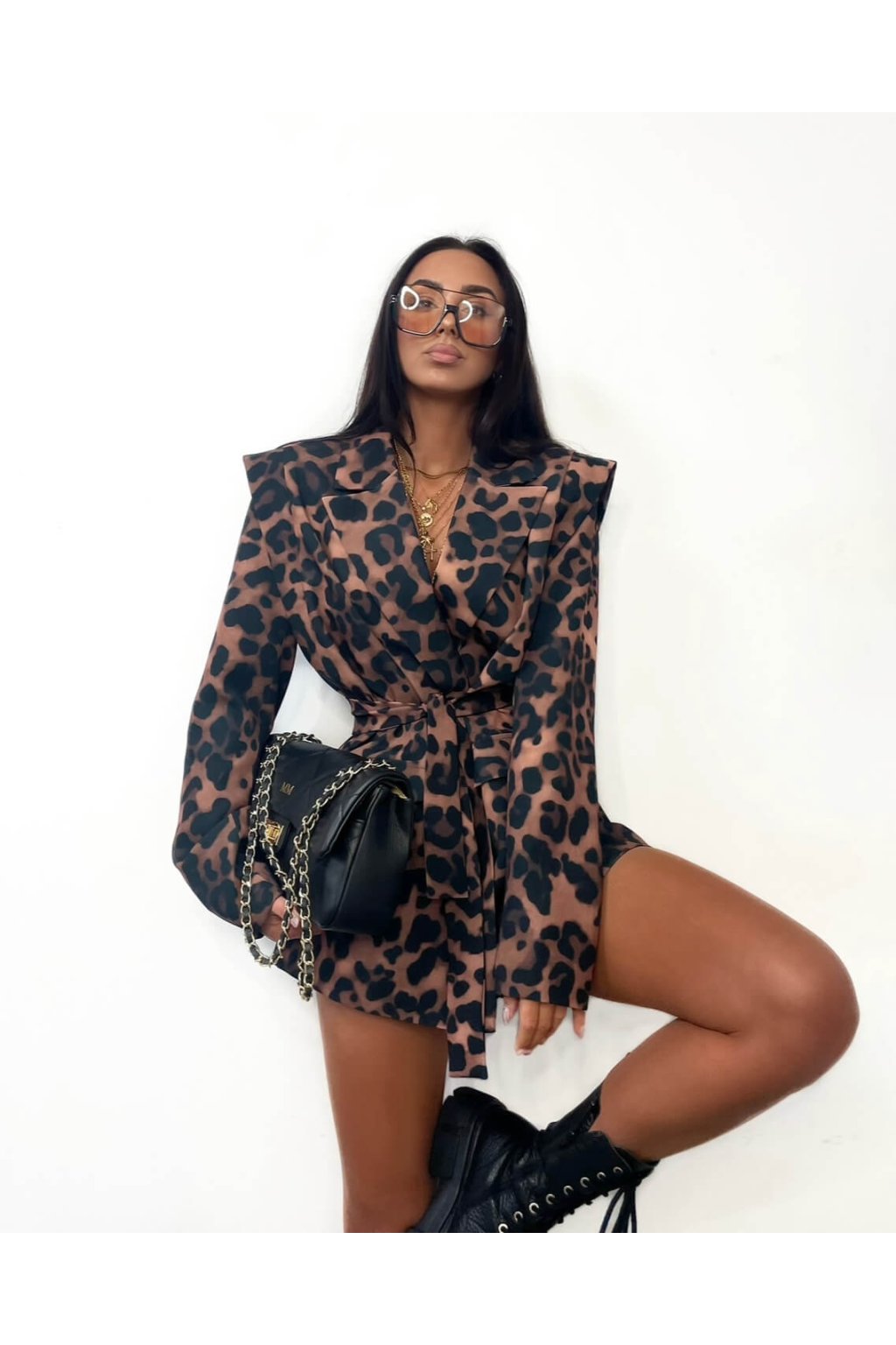 Viskózové dlhé čierno hnedé sako s leopardím vzorom a dekoratívnym prvkom na ramenách. Model má ramenné vypchávky a vrecká. Zapína sa na gombíky a opasok.