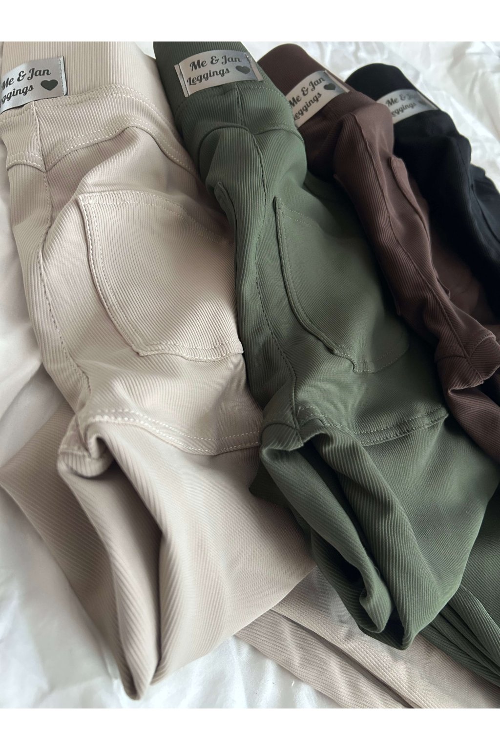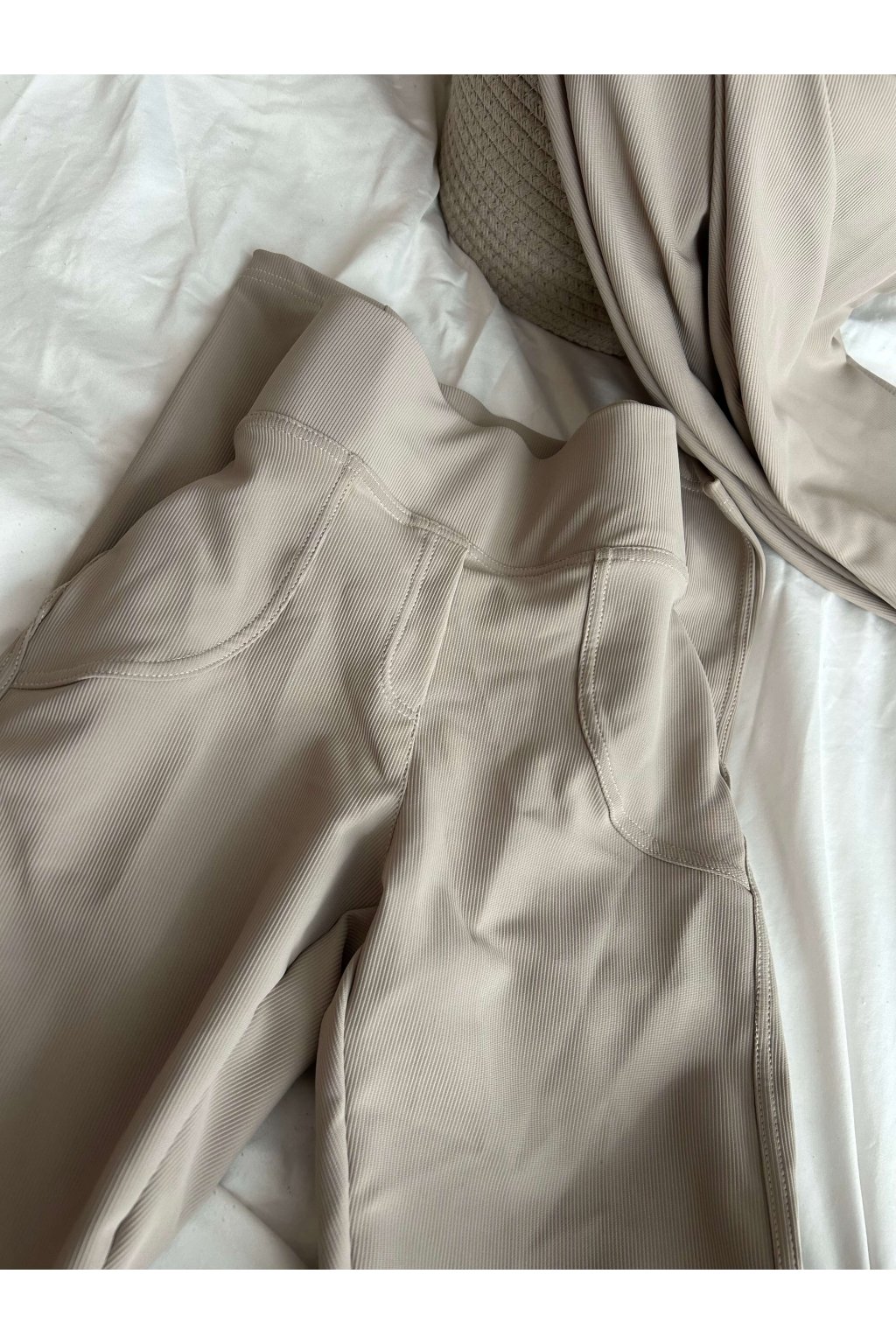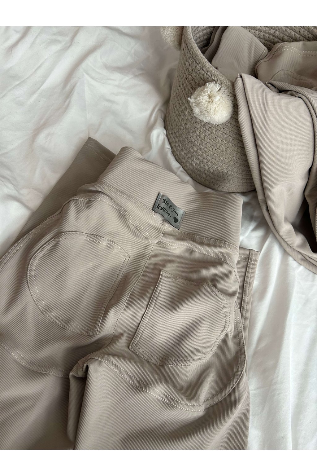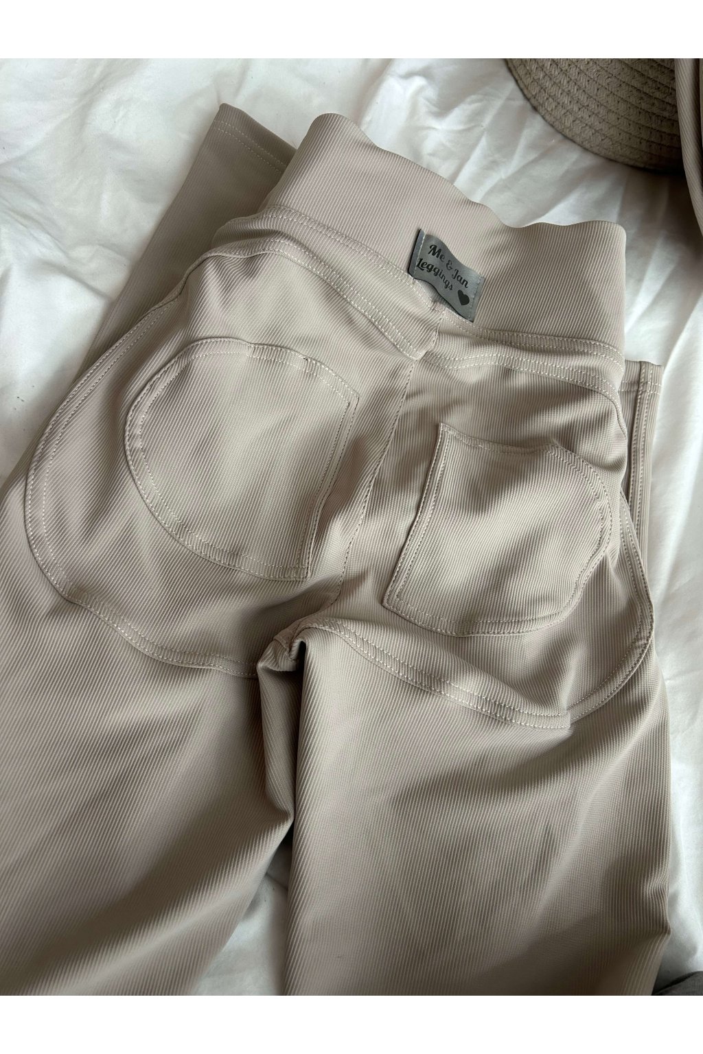 Viskózové béžové legíny s povrchom veľmi jemných vrúbkov, ktoré opticky maskujú nedokonalosti. Úplet je sťahujúci, vyhladzuje siluetu a zlepšuje celkový vzhľad. Model má vysoký pás a švy na zadku navrhnuté tak, aby zadok nadvihli.