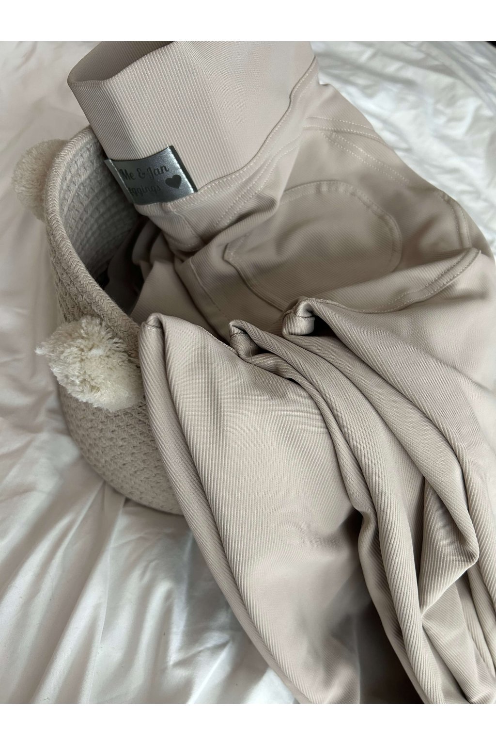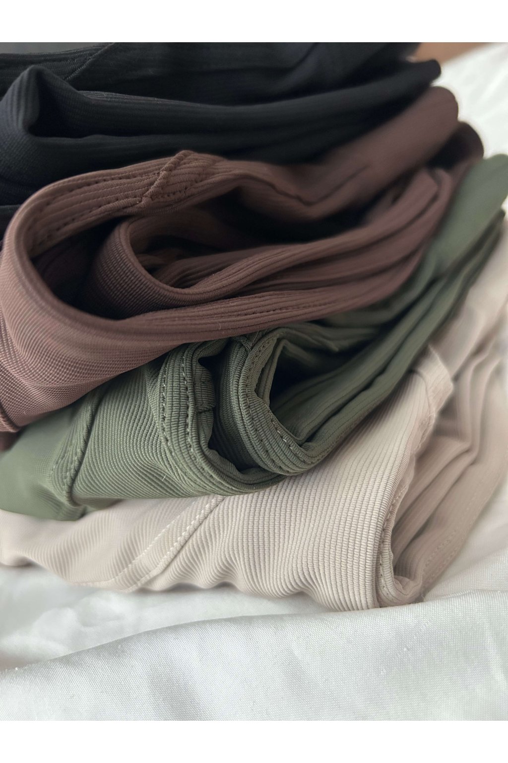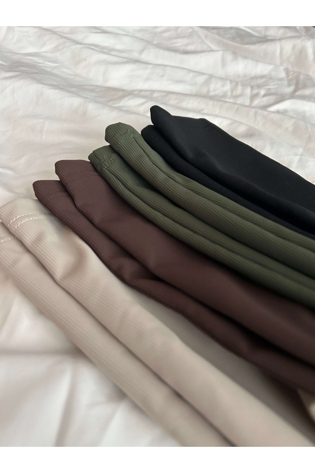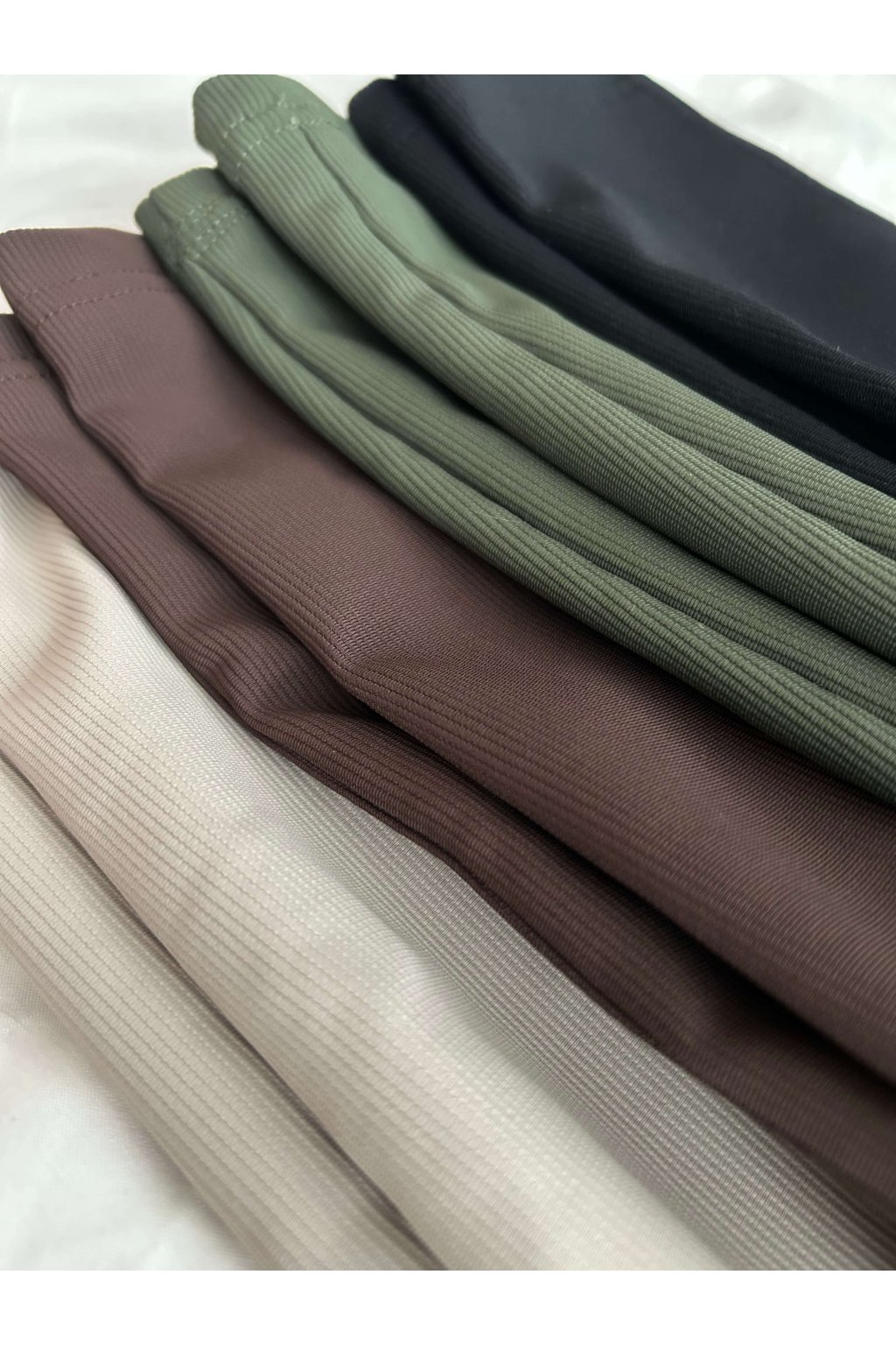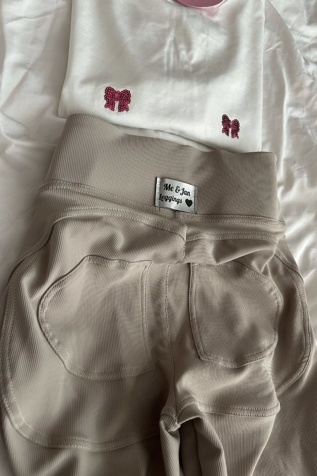 Viskózové béžové legíny s povrchom veľmi jemných vrúbkov, ktoré opticky maskujú nedokonalosti. Úplet je sťahujúci, vyhladzuje siluetu a zlepšuje celkový vzhľad. Model má vysoký pás a švy na zadku navrhnuté tak, aby zadok nadvihli.