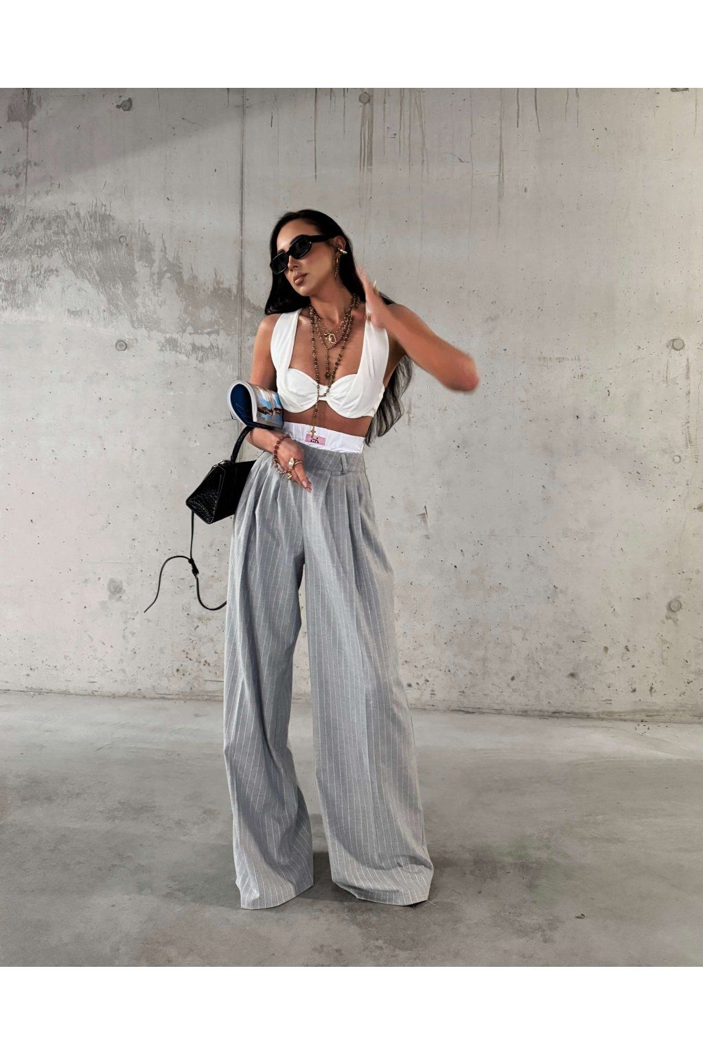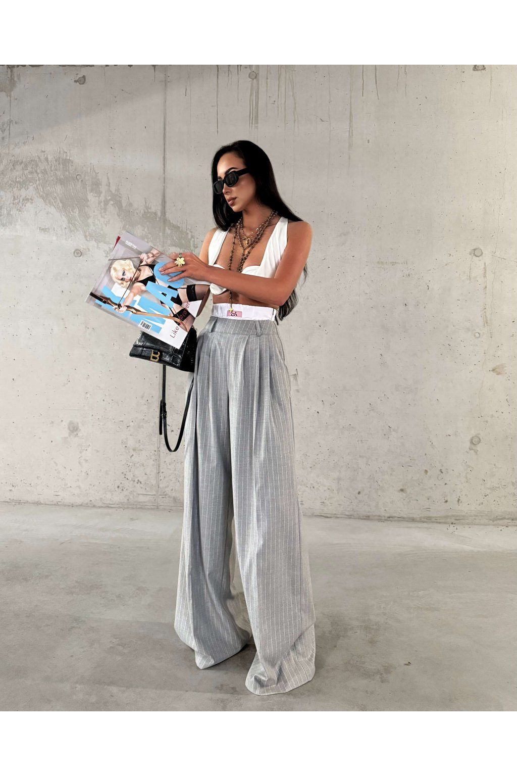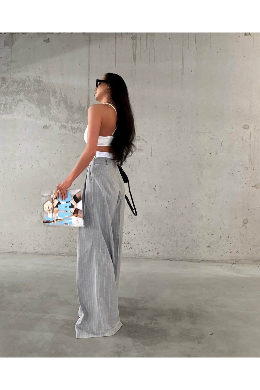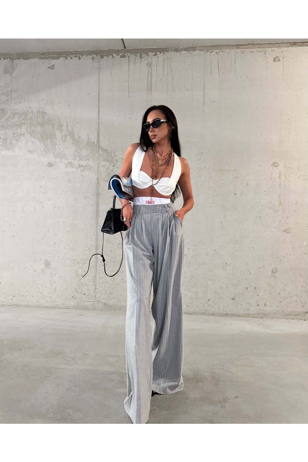 Šedé široké splývajúce nohavice s vysokým vyvýšeným pásom z mäkkej viskózy. Model má náplasť s logom značky, vrecká a zapína sa zboku zipsom vo farbe nohavíc.