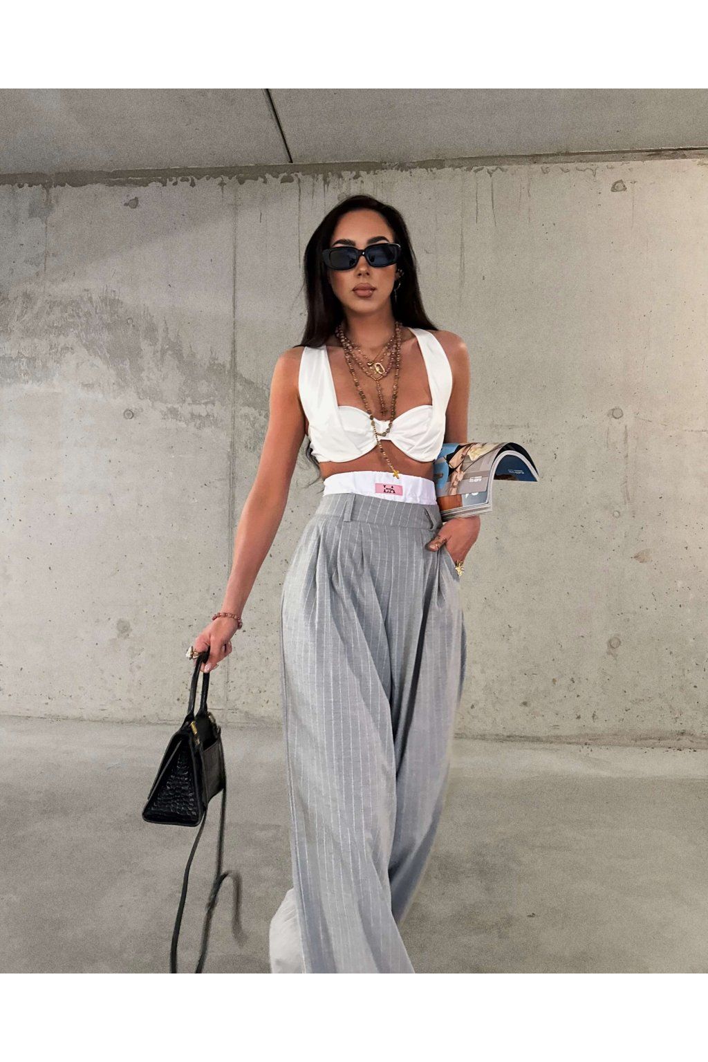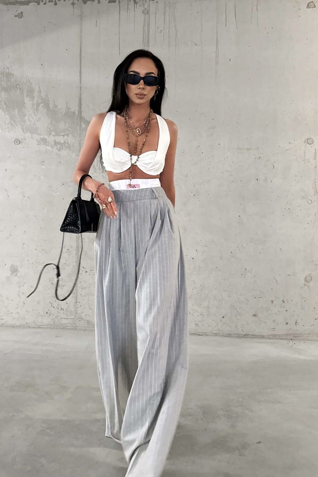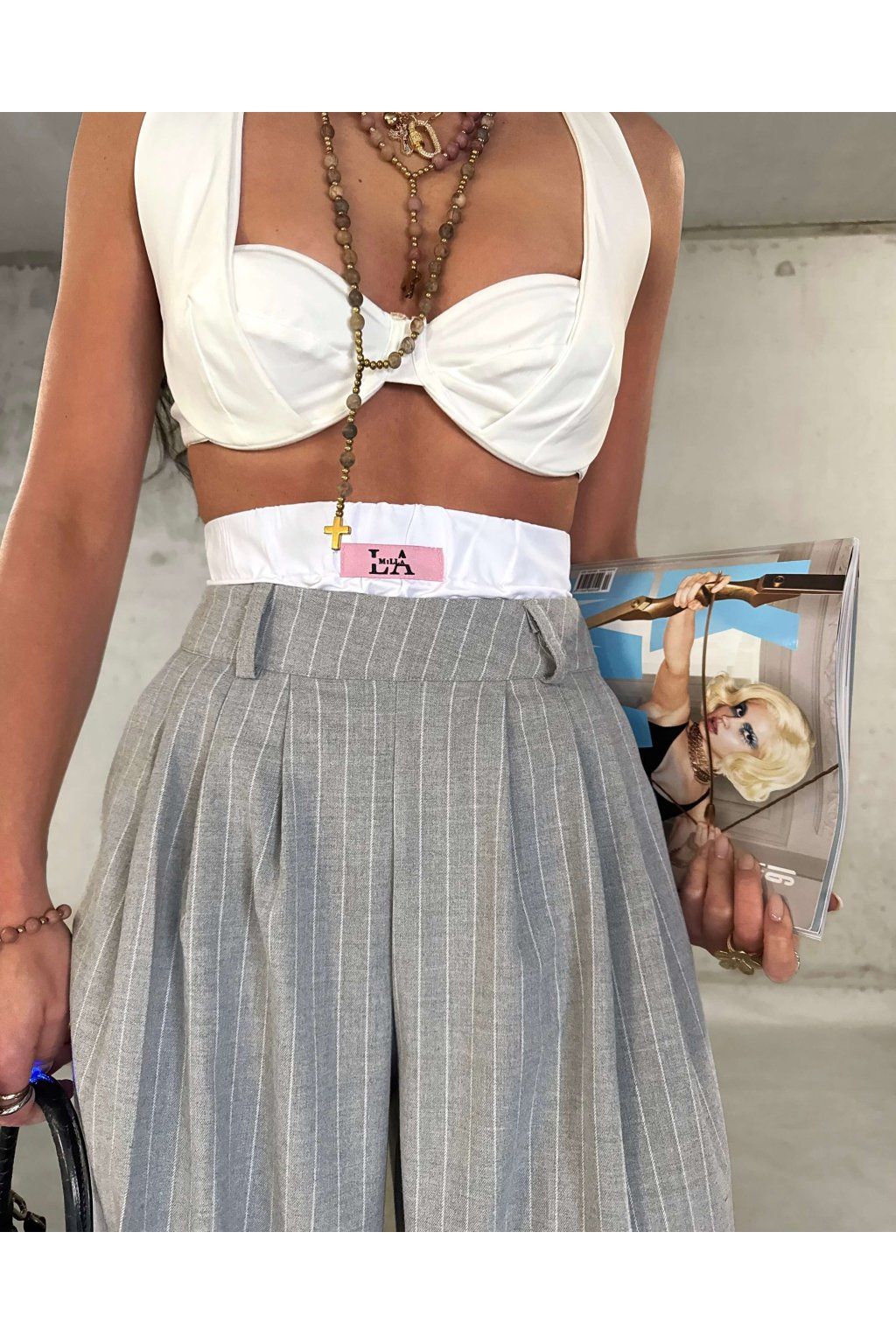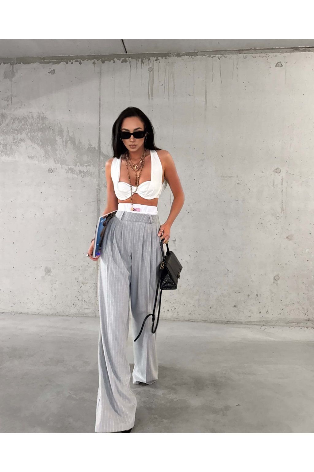 Šedé široké splývajúce nohavice s vysokým vyvýšeným pásom z mäkkej viskózy. Model má náplasť s logom značky, vrecká a zapína sa zboku zipsom vo farbe nohavíc.