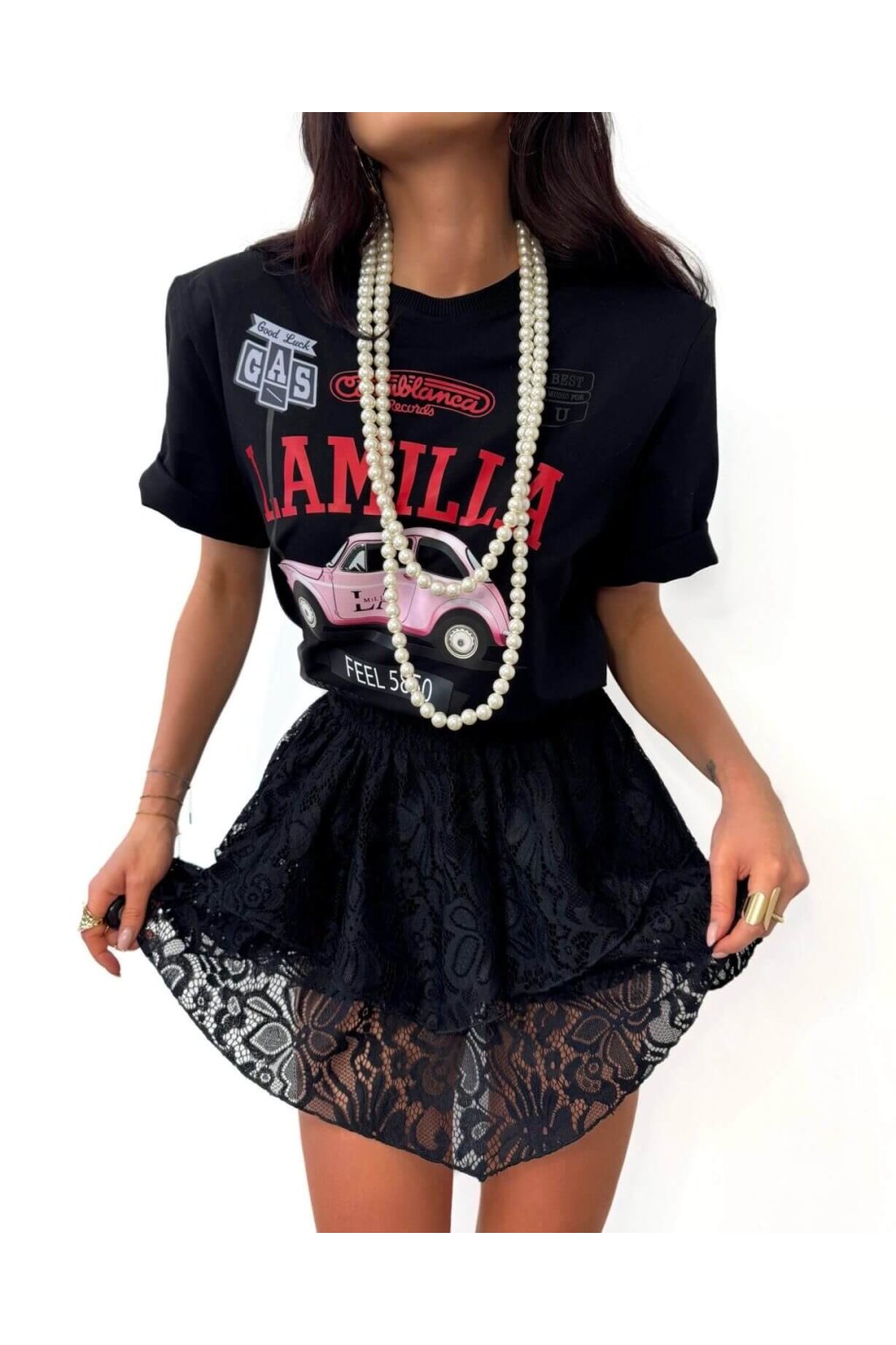 Bavlnené čierne krajkové sukňošortky jedinečné ich vrstvami volánmi. Model má vysoký elastický pás a krátku dĺžku. Vďaka kombinácii vzhľadu sukne a funkčnosti šortiek pôsobia žensky, ale sú bezpečnejšie a komfortnejšie.
