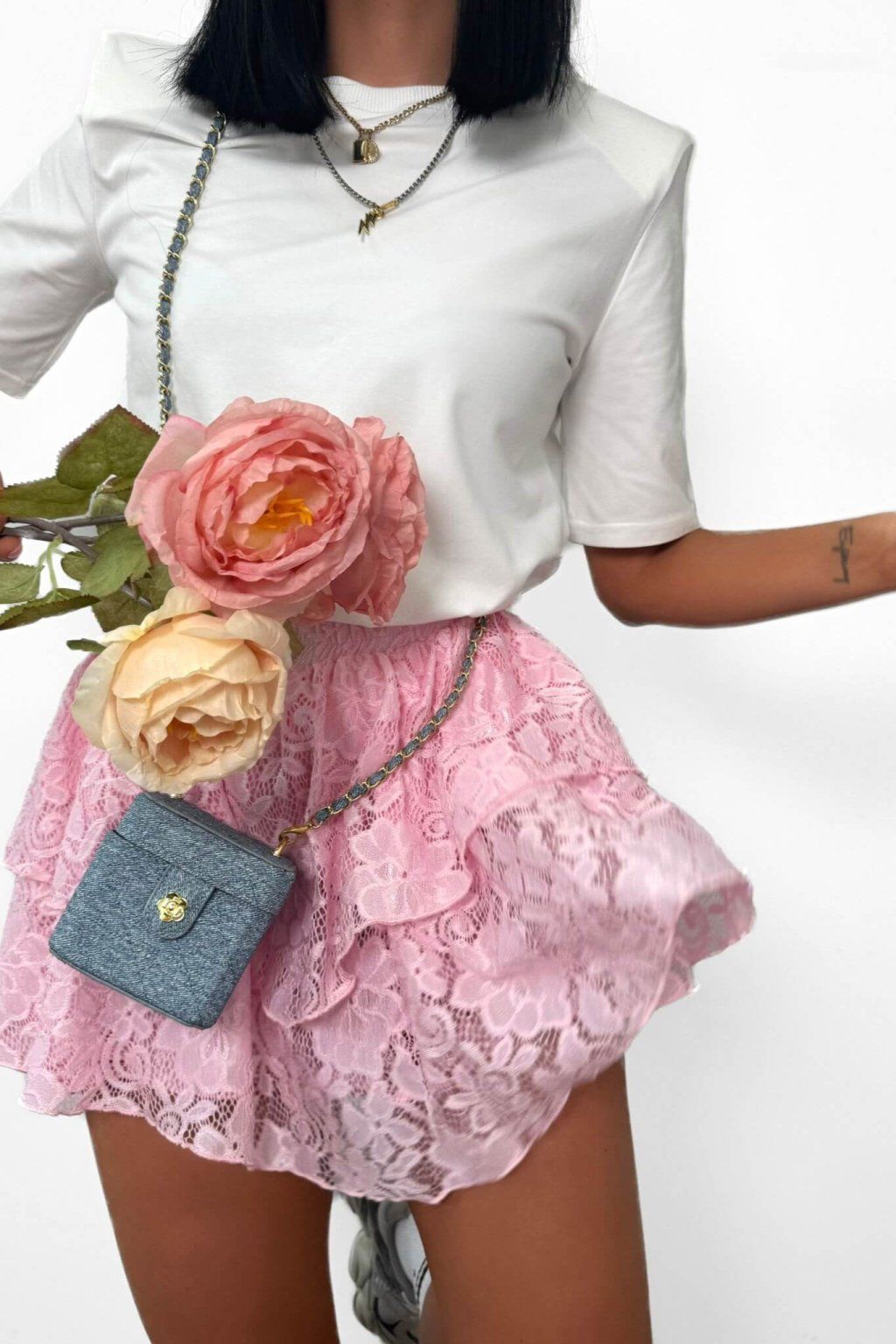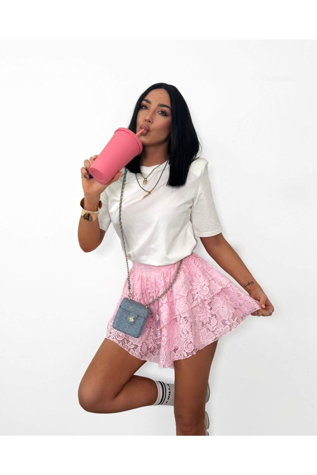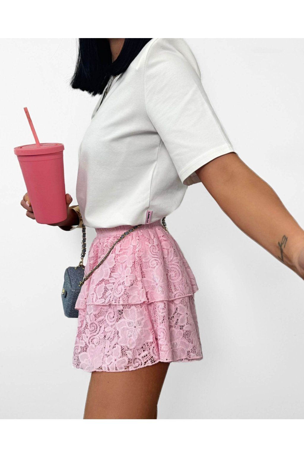 Bavlnené ružové krajkové sukňošortky jedinečné ich vrstvami volánmi. Model má vysoký elastický pás a krátku dĺžku. Vďaka kombinácii vzhľadu sukne a funkčnosti šortiek pôsobia žensky, ale sú bezpečnejšie a komfortnejšie.