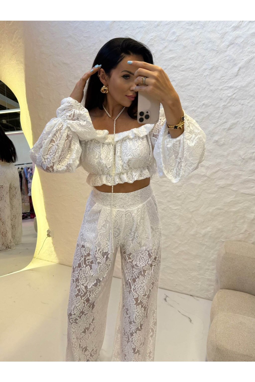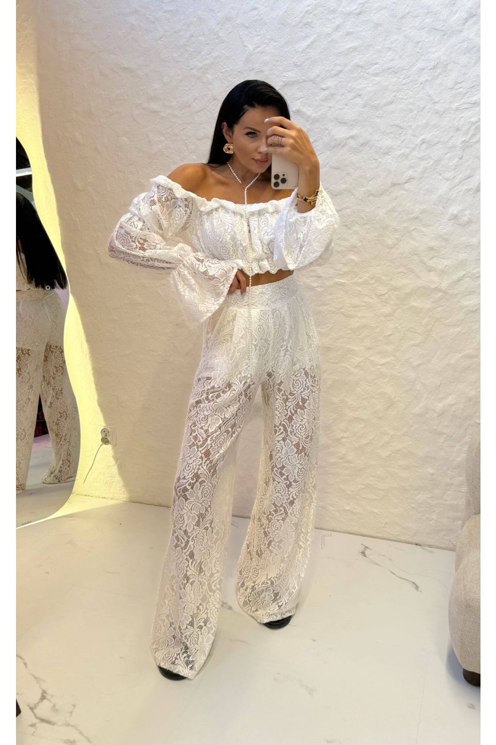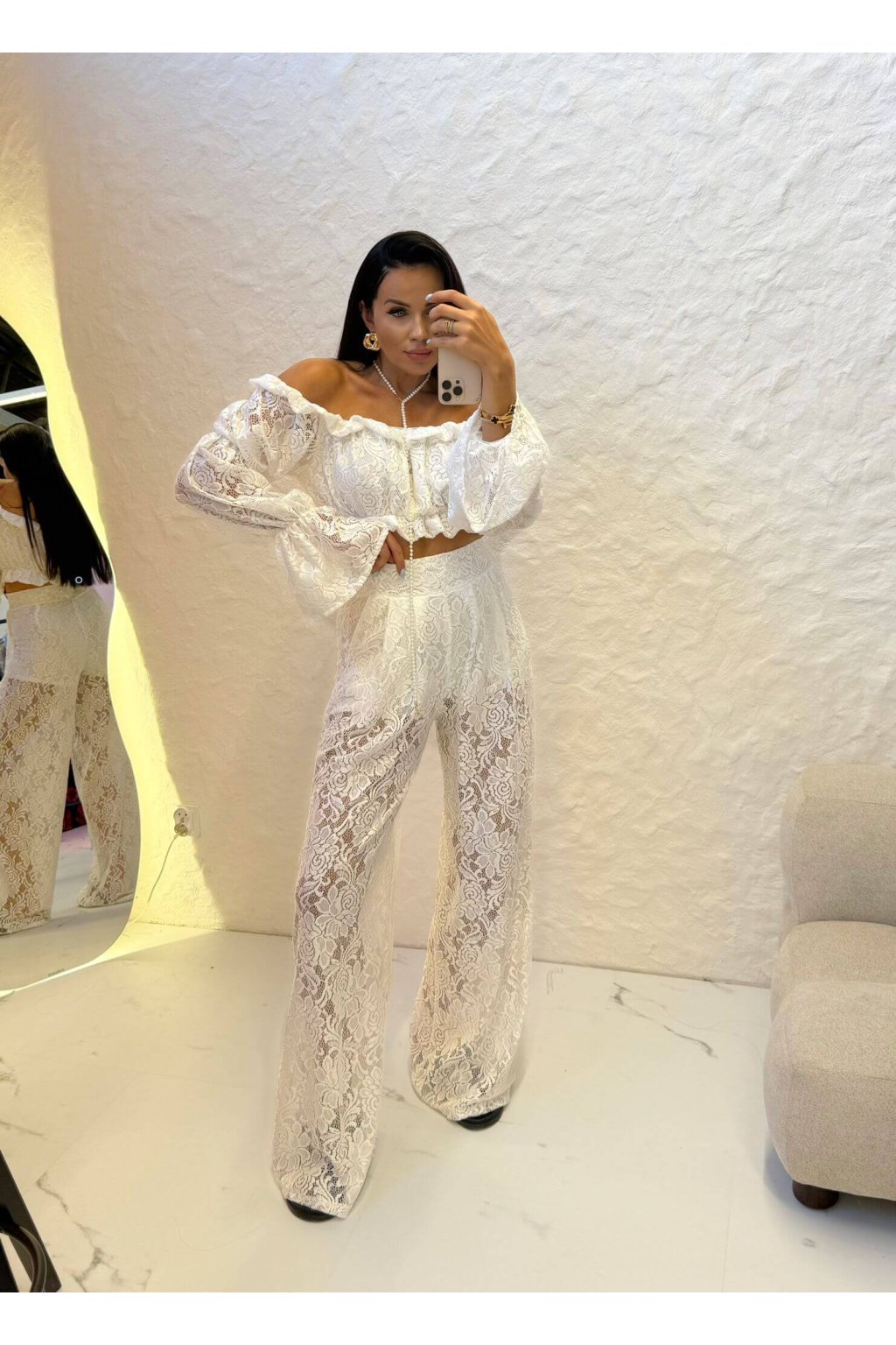 Čipkované nohavice v čistej bielej farbe so širokým rovným strihom. AMIGOS majú vysoký pás, podšívku, vrecká a romantický vzor kvetín.