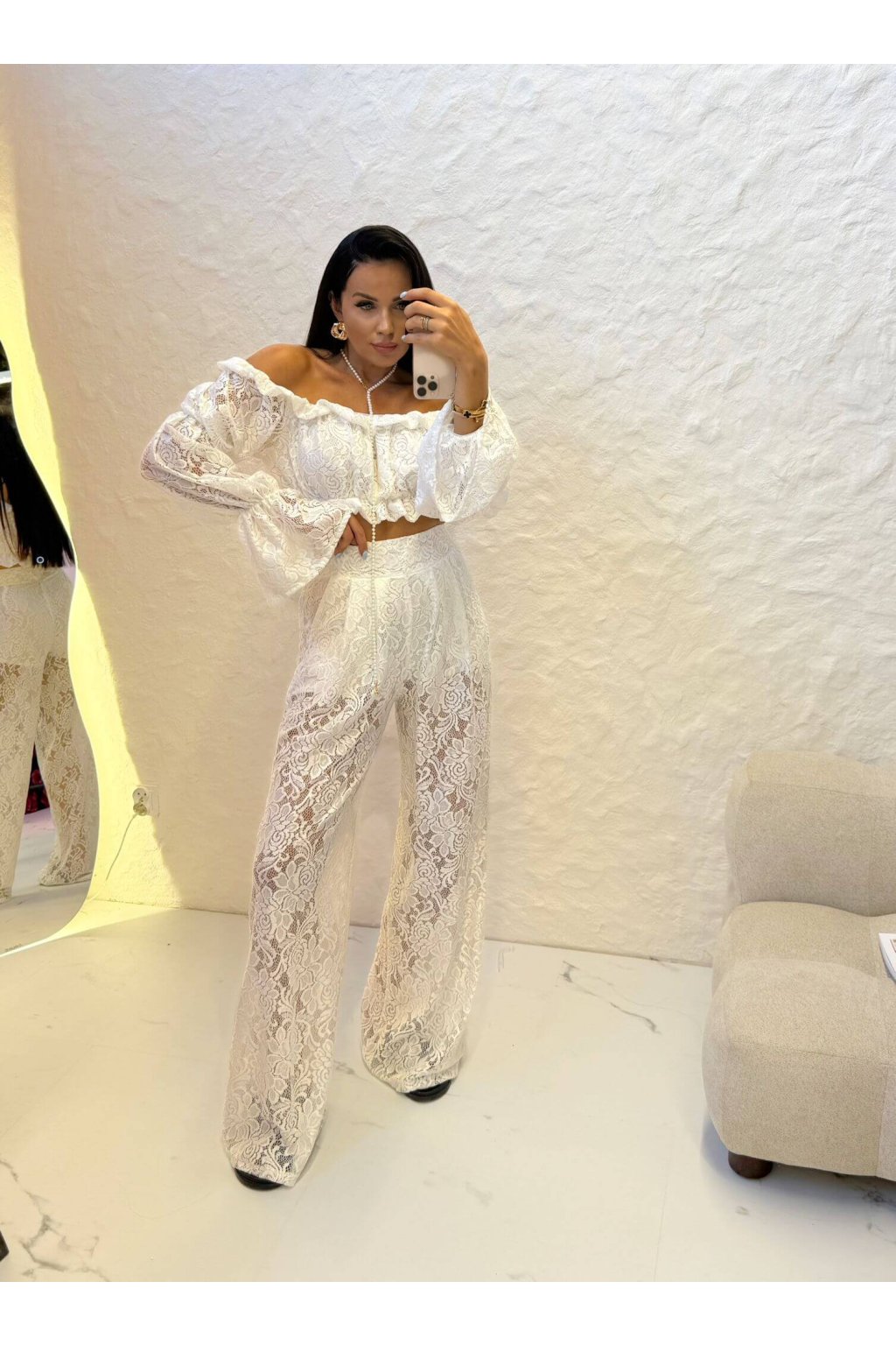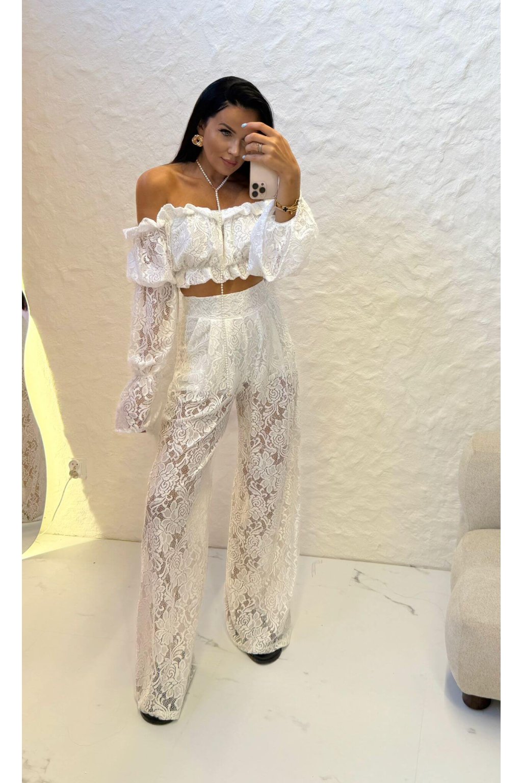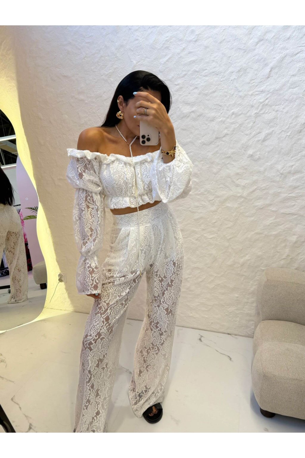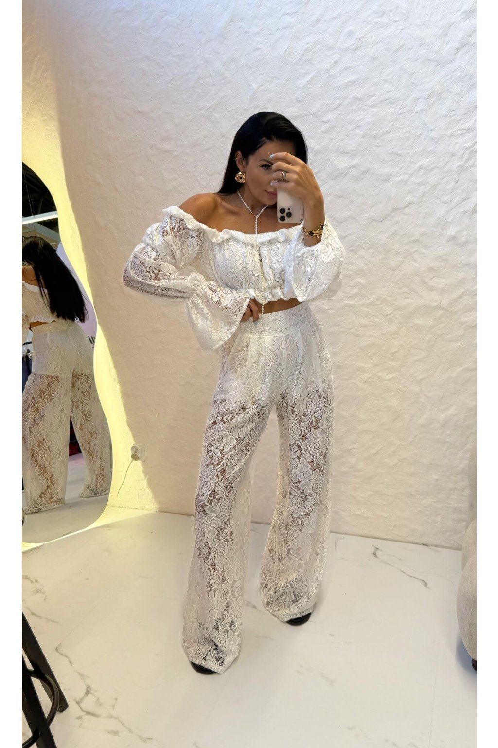 Čipkované nohavice v čistej bielej farbe so širokým rovným strihom. AMIGOS majú vysoký pás, podšívku, vrecká a romantický vzor kvetín.